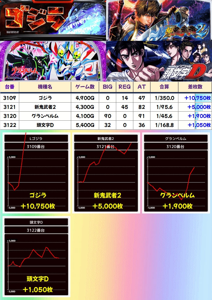 最新機種「ゴジエヴァ」の万枚、「新鬼武者2」の+5000枚など優秀台が続々!