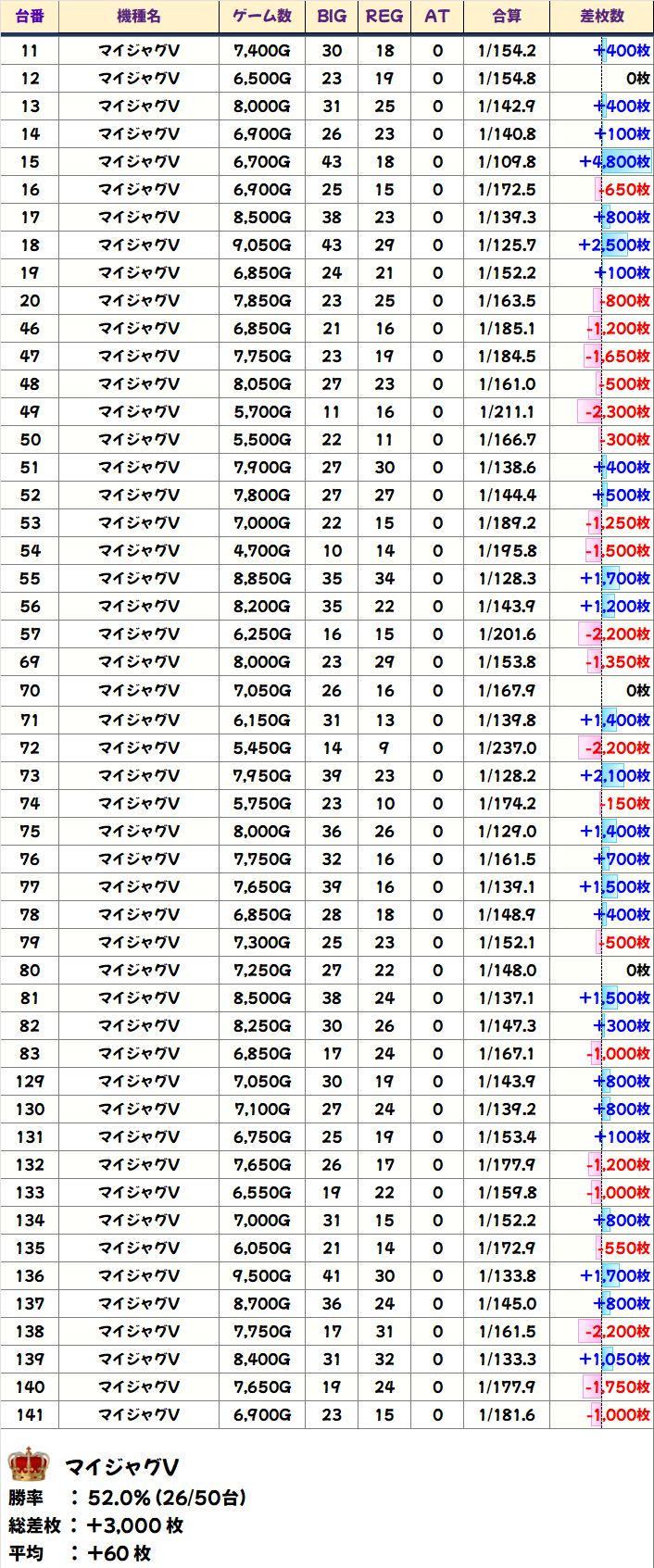 ジャグは50台以上が+1000枚超!仕掛け外のシリーズからも優秀台が多数確認できました。過去の傾向や今回を見ても優秀台が連続している箇所があるので、並びもおそらく使われていたように感じます。