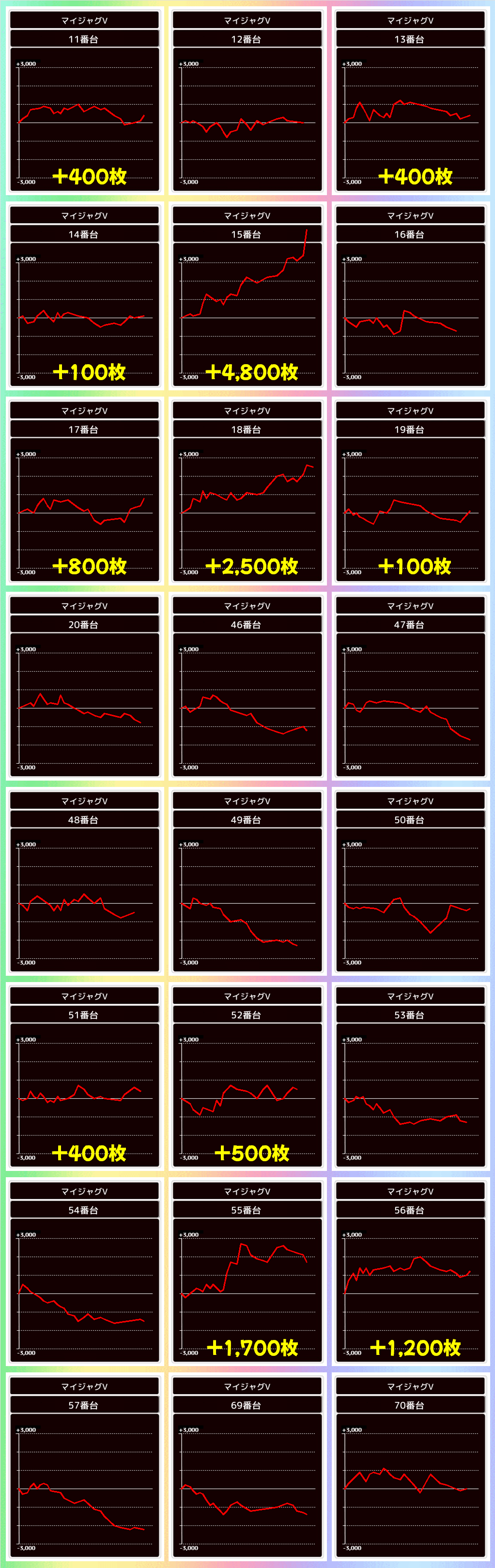 この日は万枚超3台、90台以上が+2000枚超を獲得し、平均+100枚超の結果に!鉄板の沖スロ機種の多くがランクイン!