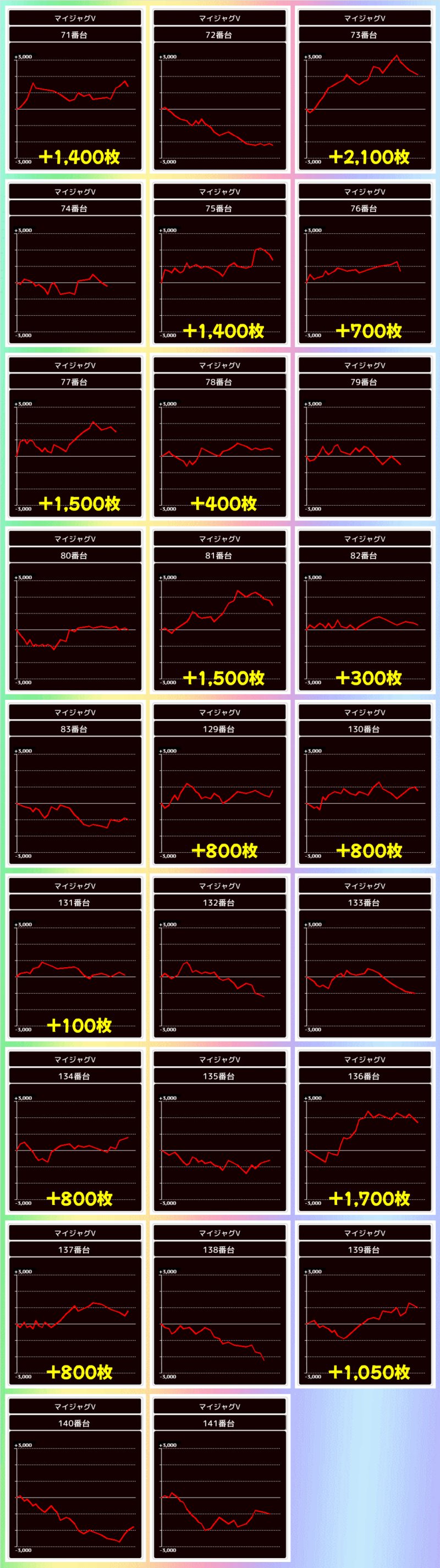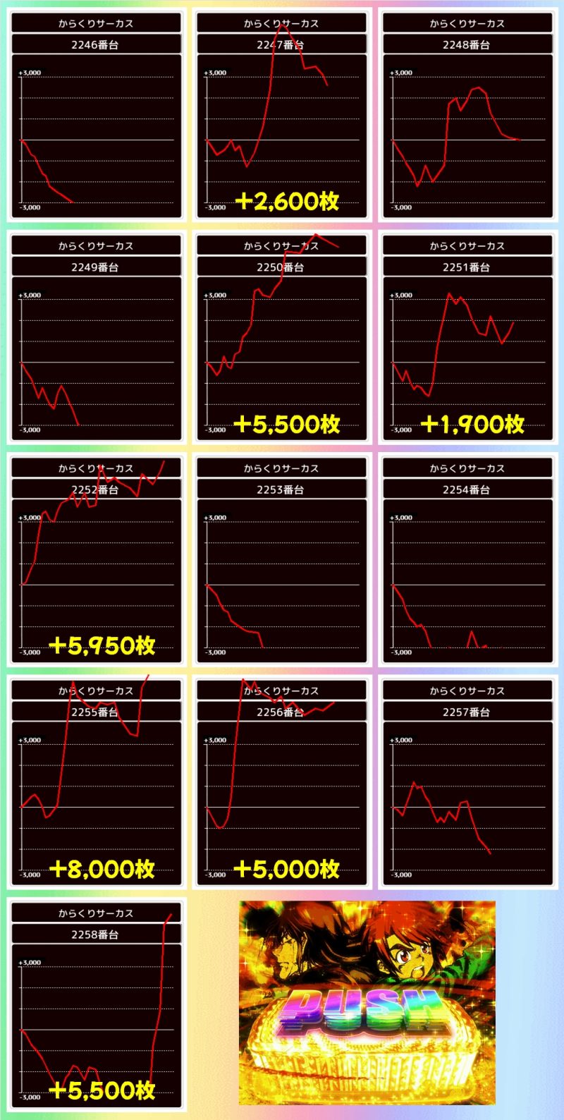 毎日オススメ機種は1/2系濃厚の2機種はもちろん、単品優秀台も複数あり!ヴァルヴレイヴの万枚超やからくりの+8000枚超をはじめ+5000枚超台を複数確認!