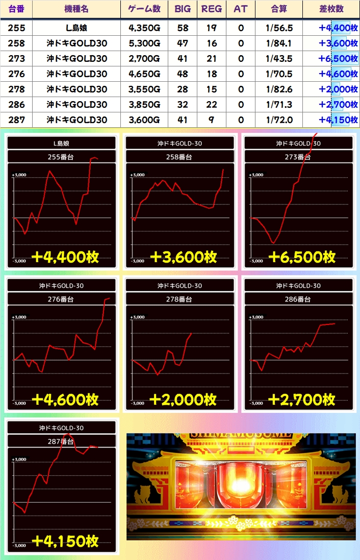 沖ドキゴージャス・沖ドキBLACK・キンハナといったメインどころも1/2系濃厚と思われる内容で、勝率は全体的に高め。その他にも単品優秀台も複数あり、沖スロエリアに座ることさえできれば勝負になる内容でした