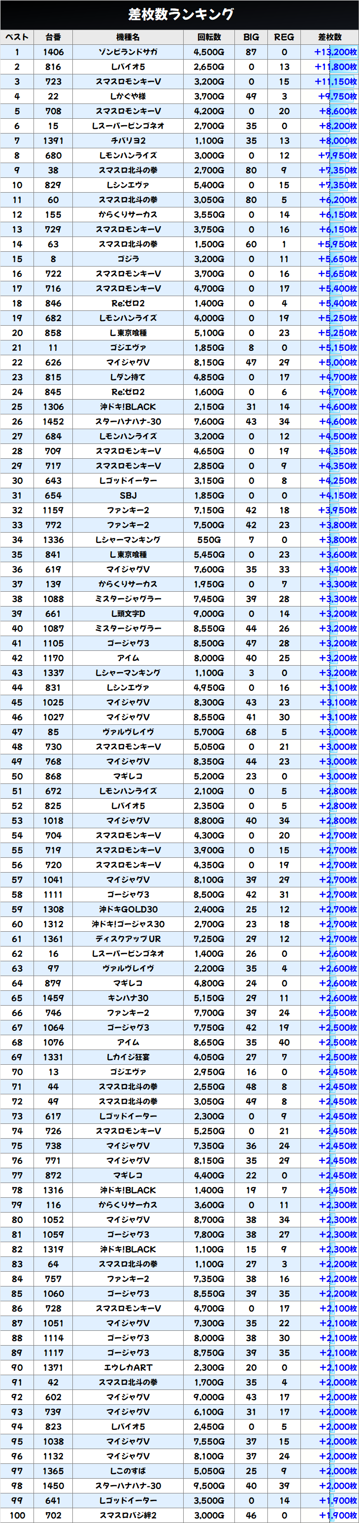2000枚以上が3台と控えめですが、6000枚超の爆裂台アリ!
