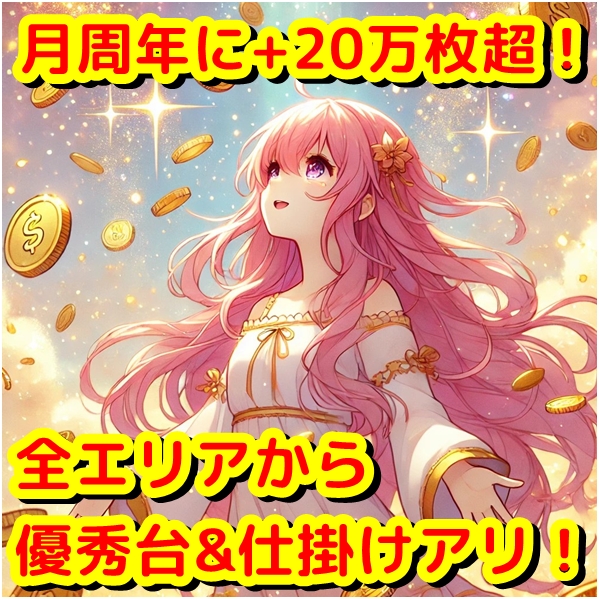 月イチ周年日はジャグが鉄板級に強いので、優先度高めで狙うべき。今回も多くのシリーズが高配分以上で全系濃厚シリーズも確認!