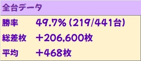 1/2系シリーズも4シリーズあり、ほとんどが勝率50%超!+2000枚や+3000枚クラスの台も確認できたので、高配分シリーズにも高品質台は複数使われていたと思われます。
