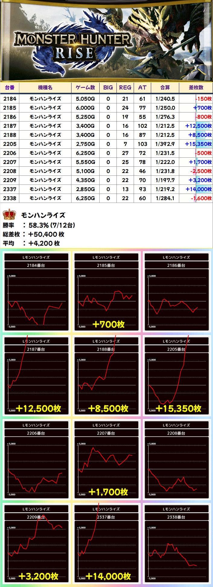 モンハンライズだけで万枚超3台!結果はもちろん稼働も優秀で、全系濃厚だったと思われます。主力機のモンハンだけで総差枚5万枚超はかなり上出来な結果でしょう。