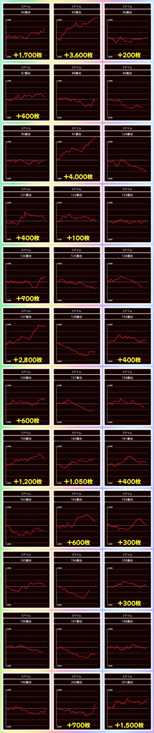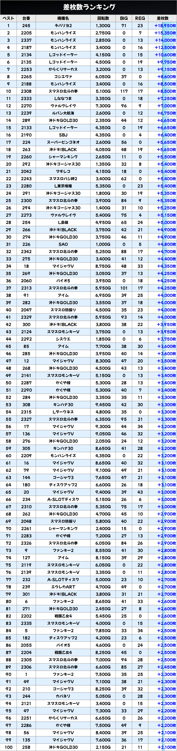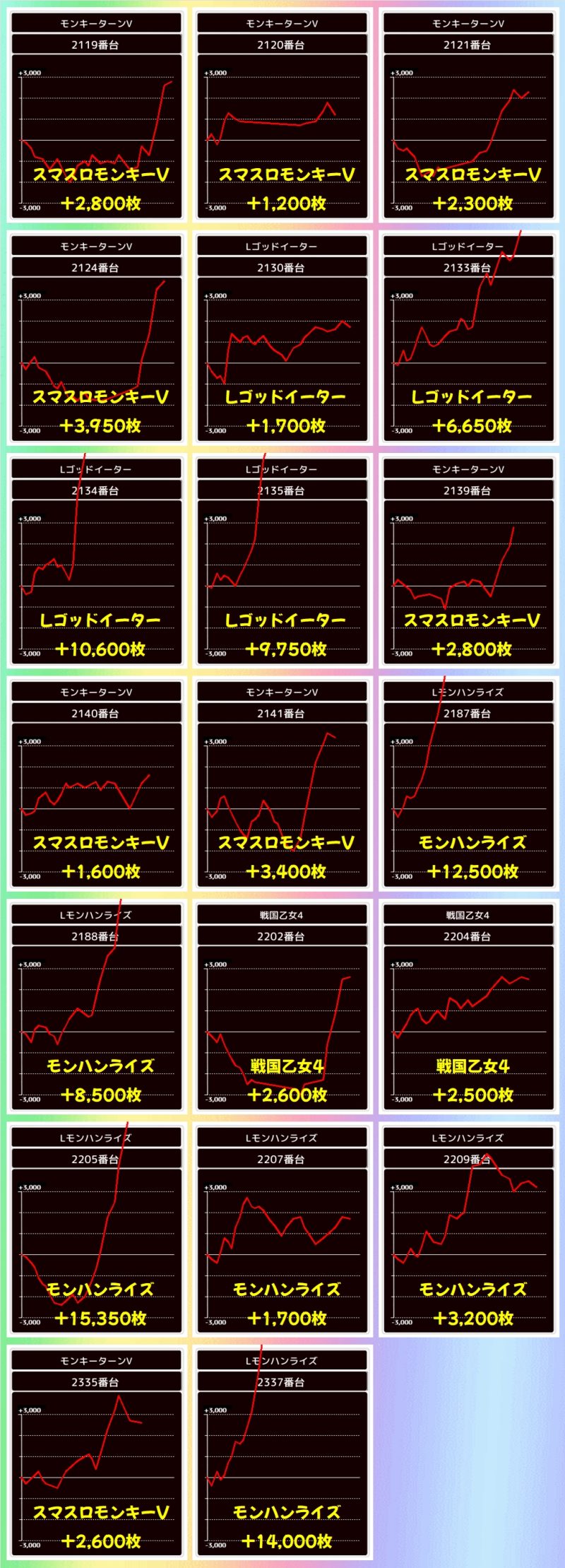 全系濃厚のモンハンライズ以外からもゴッドイーターから万枚クラスが複数出現!モンキーVからも+2000枚超が複数あり、ゴッドイーターとモンキーVは高配分以上だった可能性大!主力機は毎日優秀台がありますが、特日では頭一つ抜けて手厚い仕掛けとなっていました。