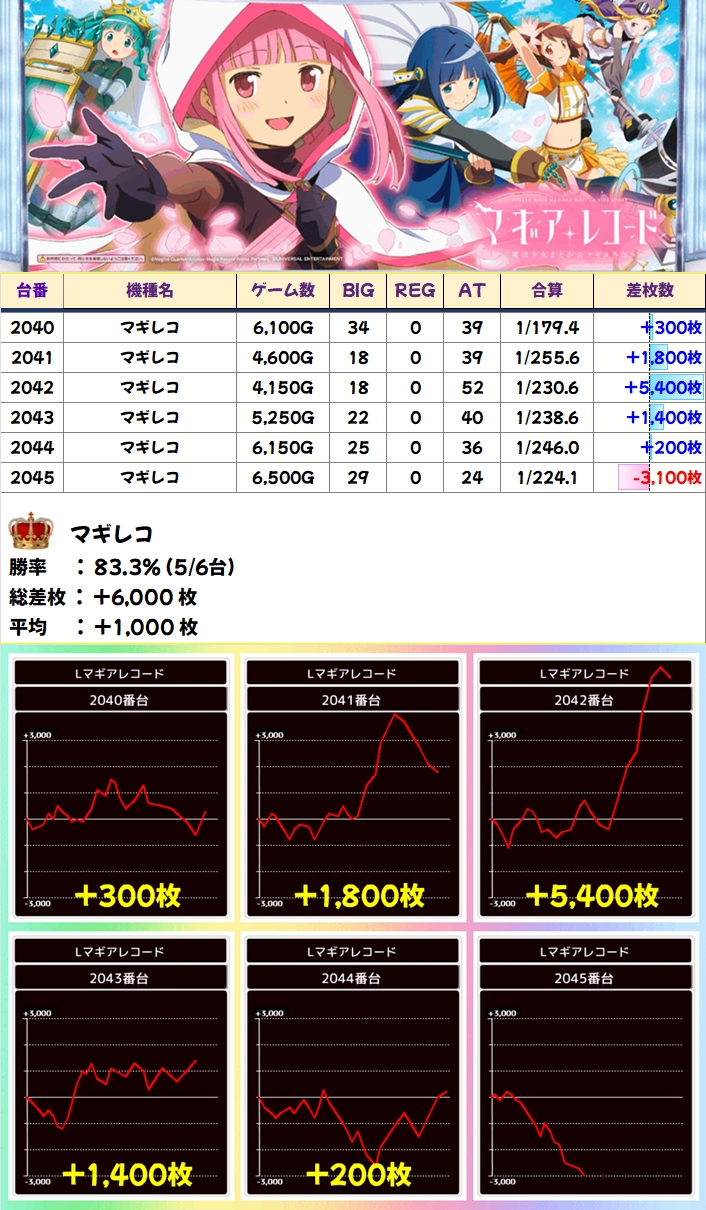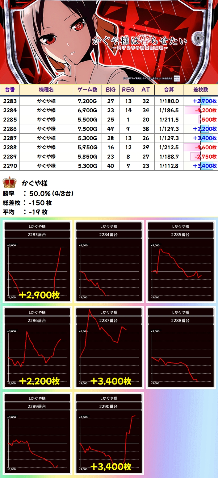 最新のマギレコも扱いが良く、平均1000枚のプラス!かぐや様も優秀台が複数ありましたが、不発となってしまった台も多く結果としてはマイナスに。稼働を見れば粘っていたことは明らかでしょう!