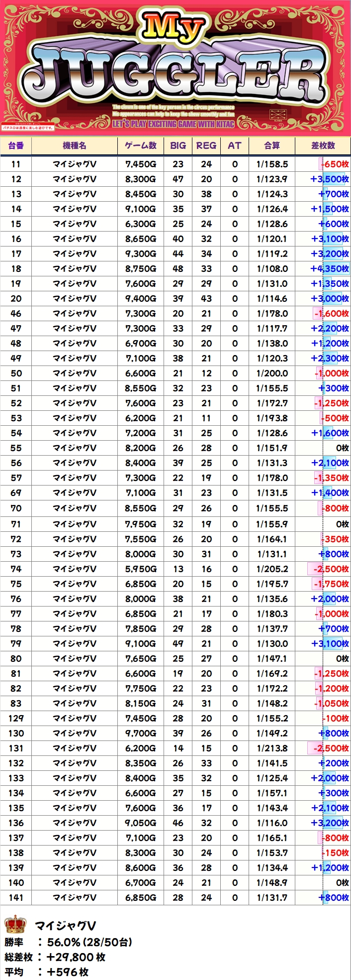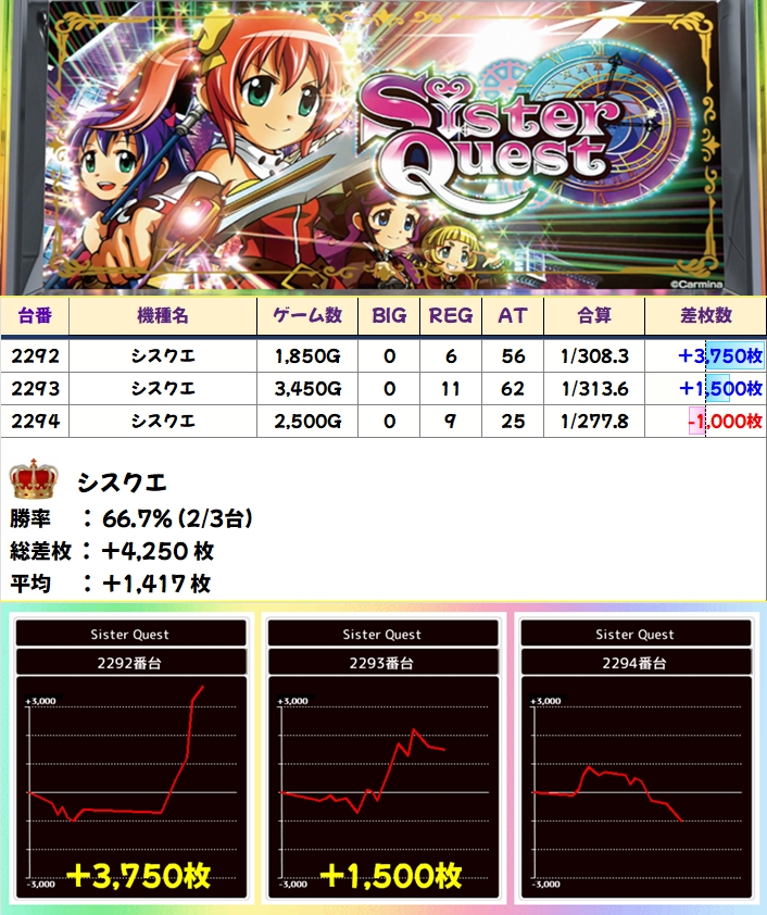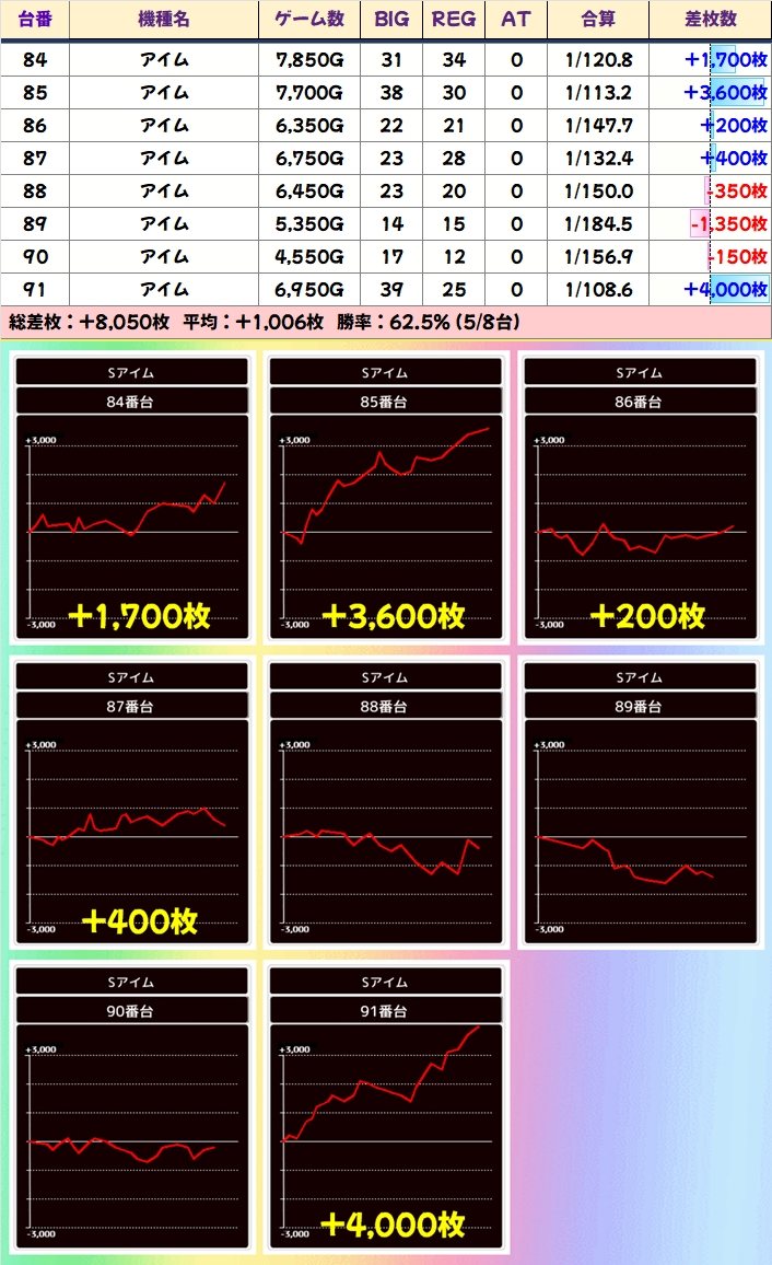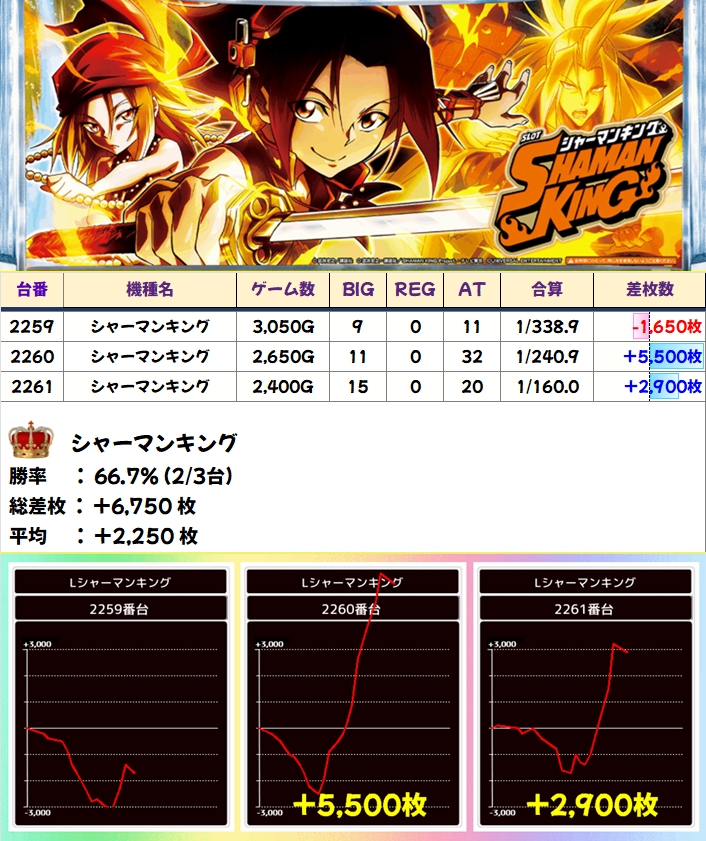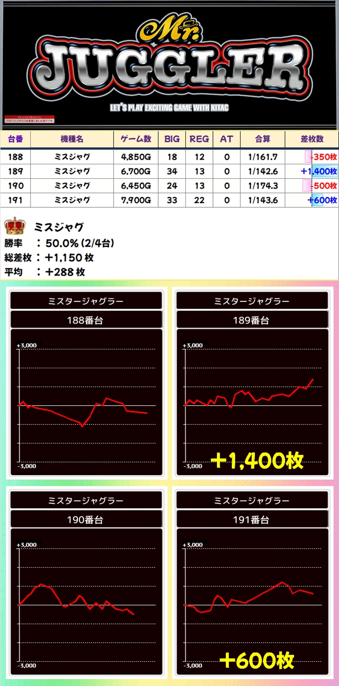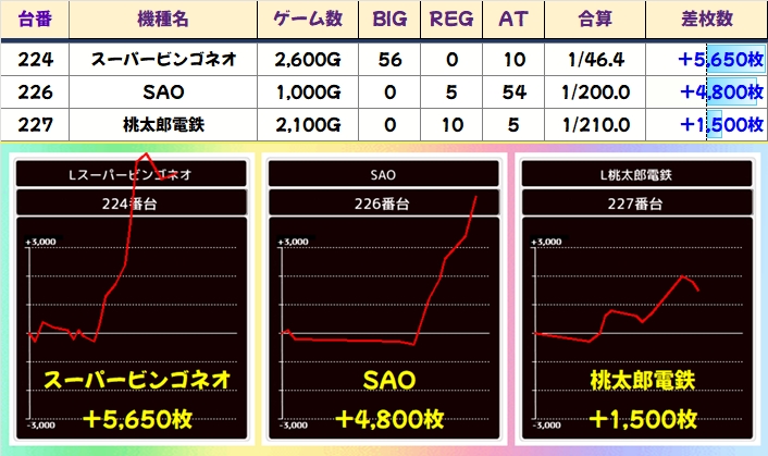 今回もこれまでの傾向に沿って、ジャグや毎日系、ノーマルなどから強烈仕掛けを確認!パチスロだけで勝率約50%、台平均は450枚超の超優秀成績でした。