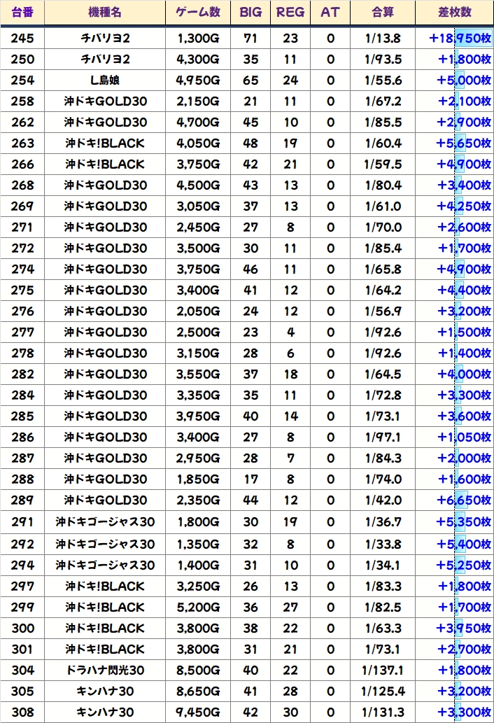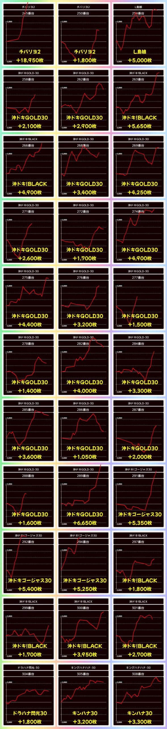 沖スロからも優秀台が数多くあり、上記6機種は高配分以上だったと思われます。チバリヨからはコンプクラスが出現し、沖ドキシリーズからも+3000枚超台多数あり!ハナハナシリーズもツモッたときの恩恵は大きいので、ジャグなどが取れなかった際に攻めるのはありですよ。