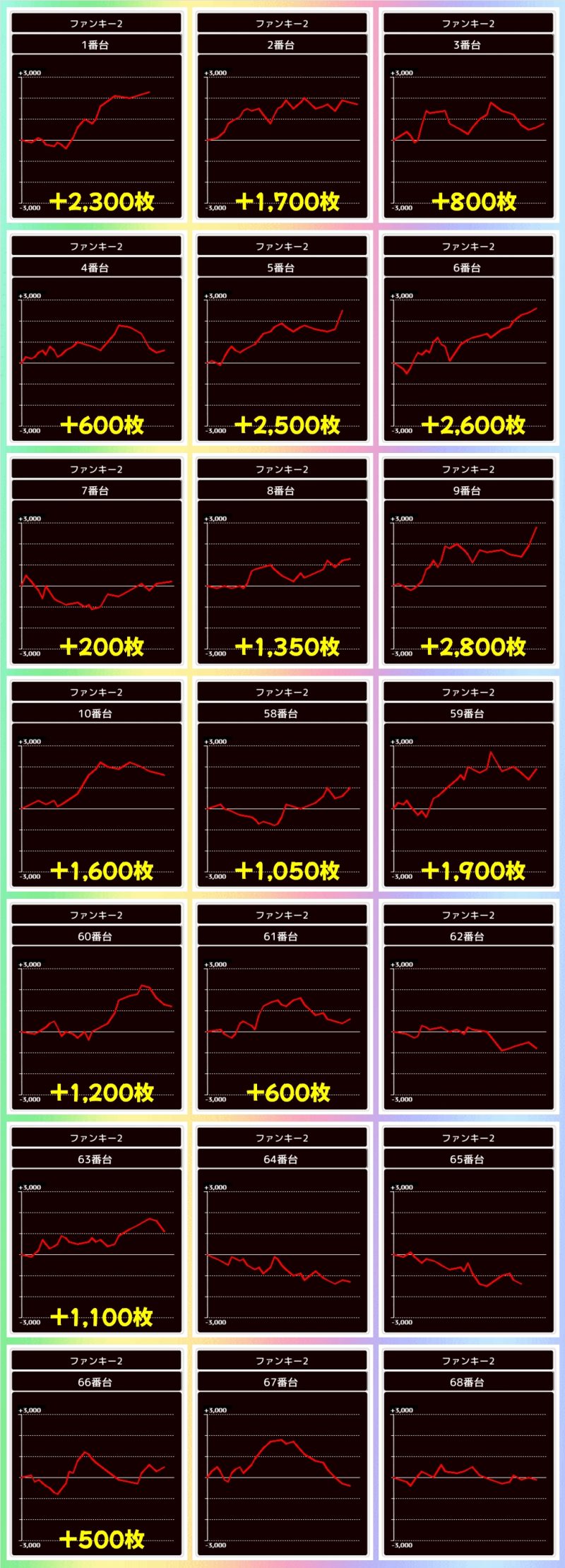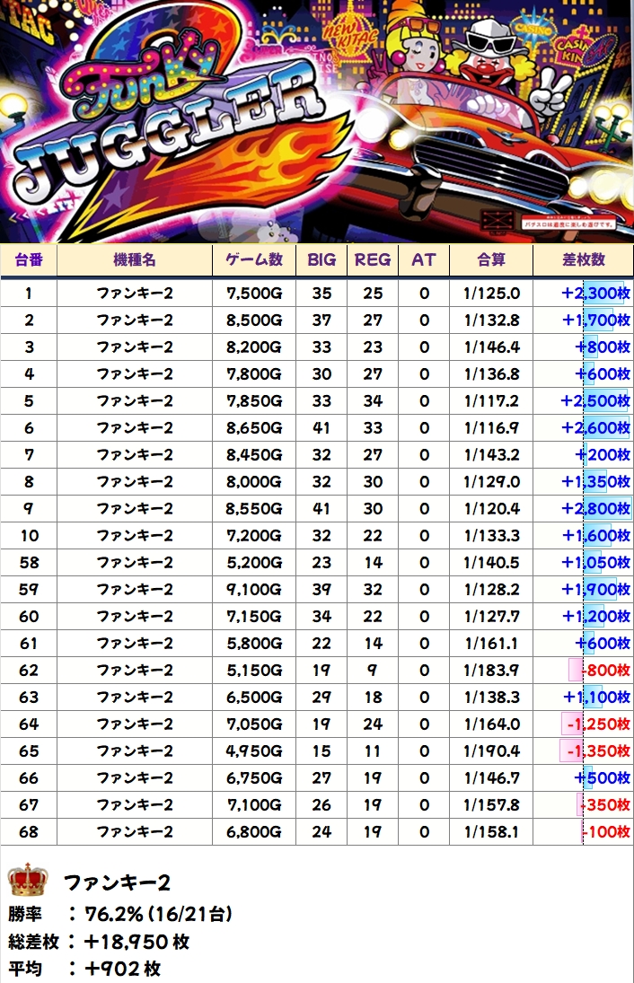 今回はファンキー2が全台系濃厚!8割弱がプラスで台平均も900枚超のプラス!毎回いちシリーズは全系濃厚になることが多いので、少台数~中台数シリーズは狙うのもあり!
