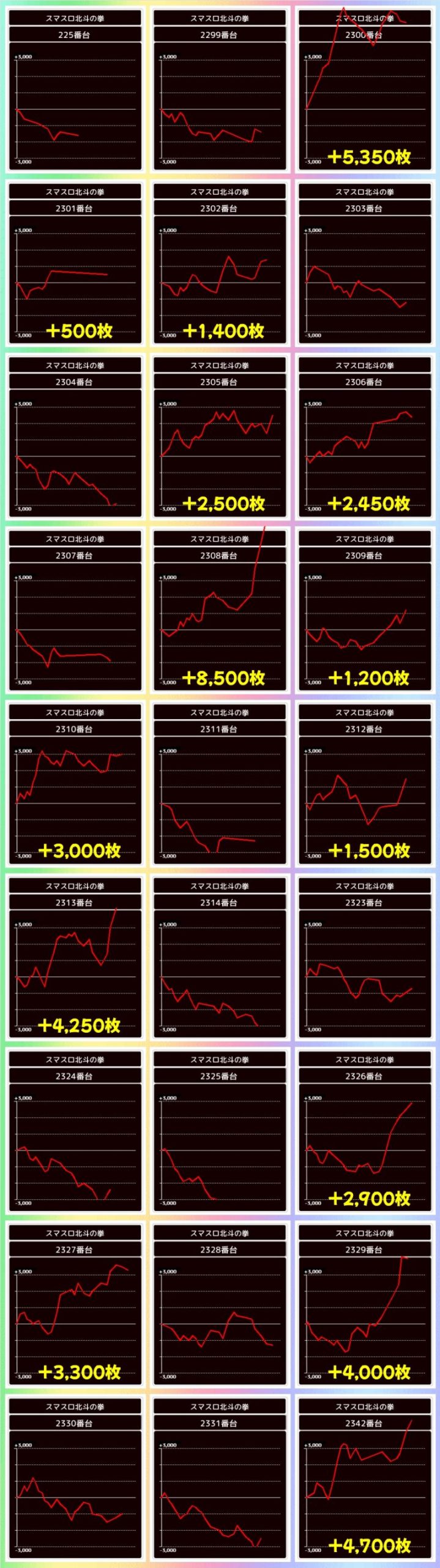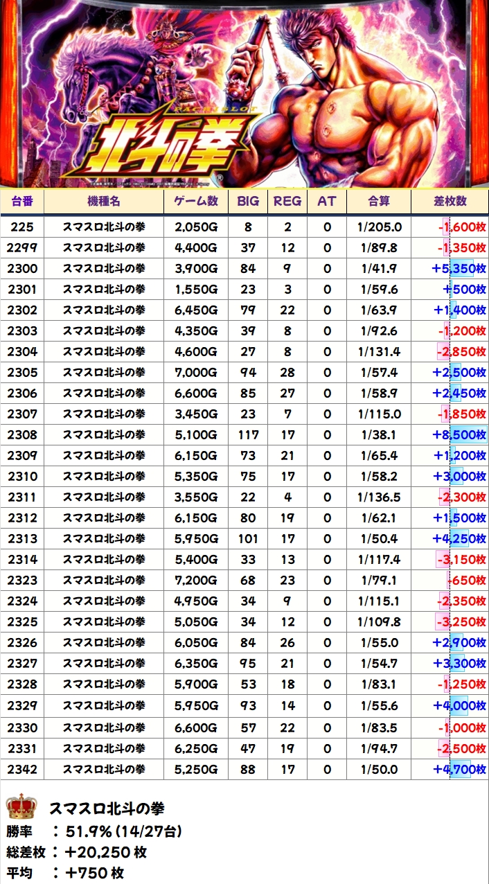 月周年に毎回仕掛けが絡む北斗は今回1/2系以上!不発台はありますが+8000枚や+4000枚超といった優秀台も多数あり!なによりほとんどの台が粘られているので、打っていた方は粘るべき台であることは察していたのでしょう。