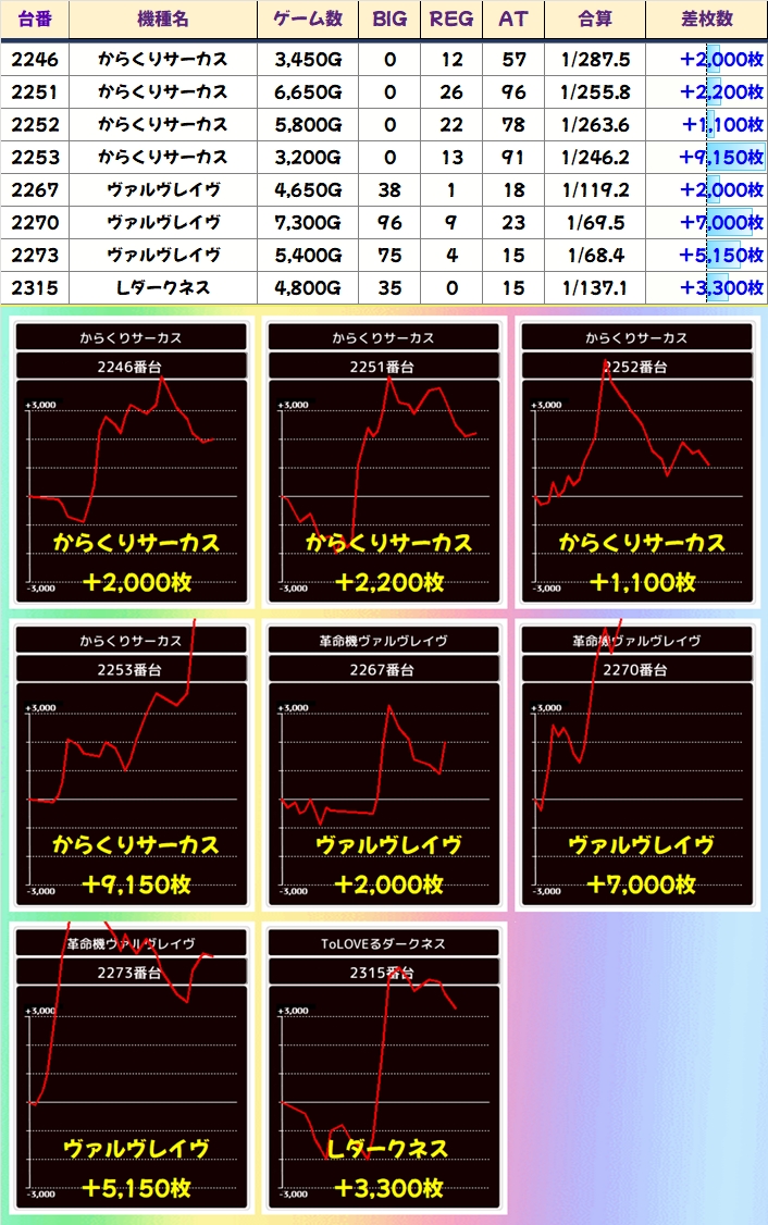 毎日機種は北斗が高配分以上でからくり、ヴヴヴ、ToLOVEるの3機種からも優秀台あり!からくりからは万枚クラスの台が出現し、ToLOVEるやヴヴヴからは+5000枚超台アリ。ヴヴヴは勝利から見ても高配分以上はあったのでしょう!