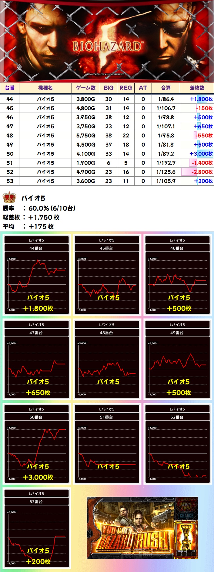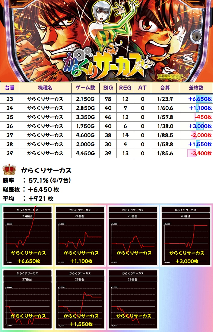 まずは人気機種の【スマスロモンキーV】【バイオ5】【からくりサーカス】から!平均差枚数はプラスとなり、各機種から優秀台を多数確認!しっかりと使われていましたね!