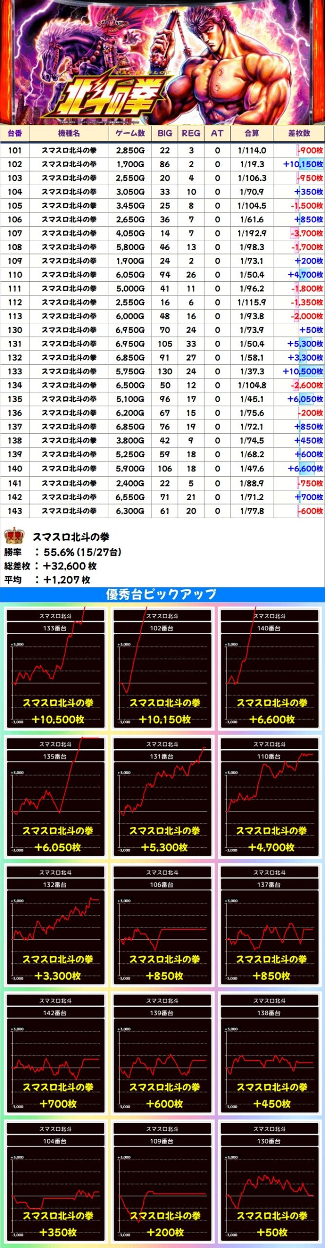 🌈スマスロ北斗の拳(27台)【平均+1207枚】