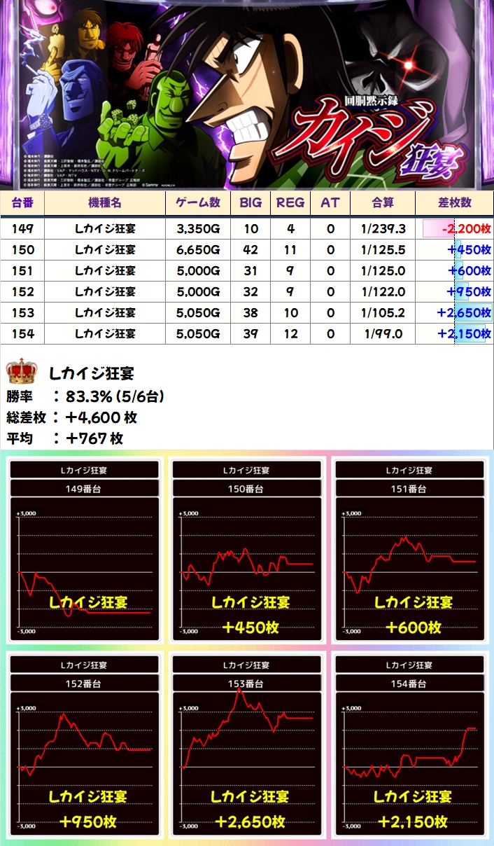 続いては【Lカイジ狂宴】で、こちらも1台マイナスでしたがグラフが高挙動&全台打ち込みもバッチリだっただけに粘る根拠が出ていた可能性大!