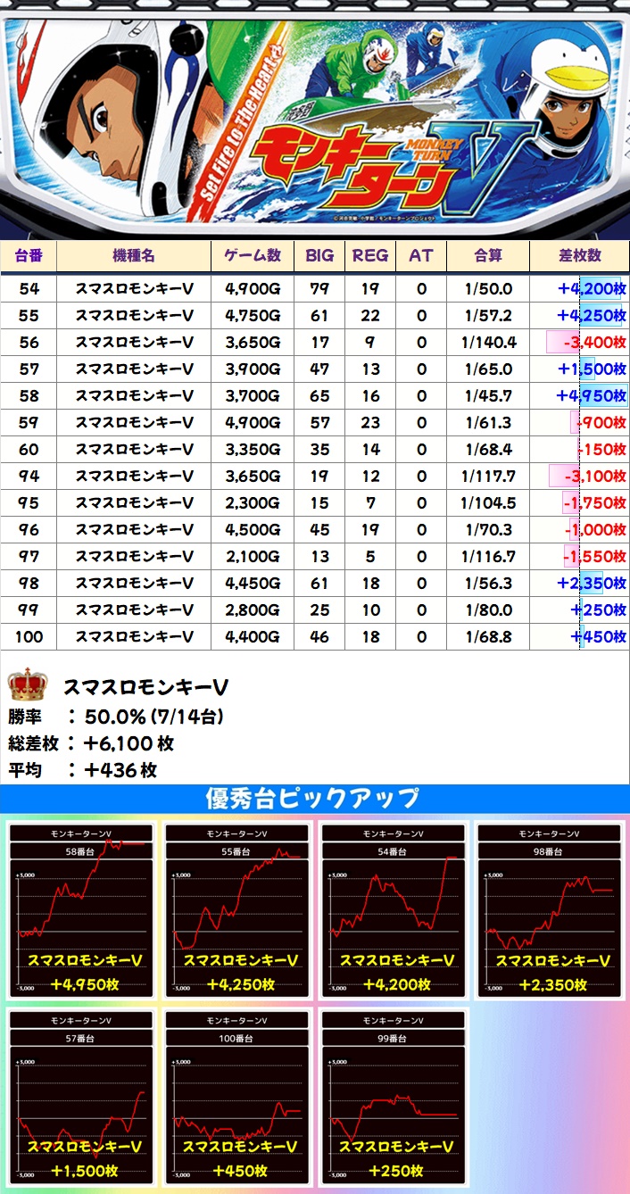 🌈スマスロモンキーV(14台)【平均+436枚】