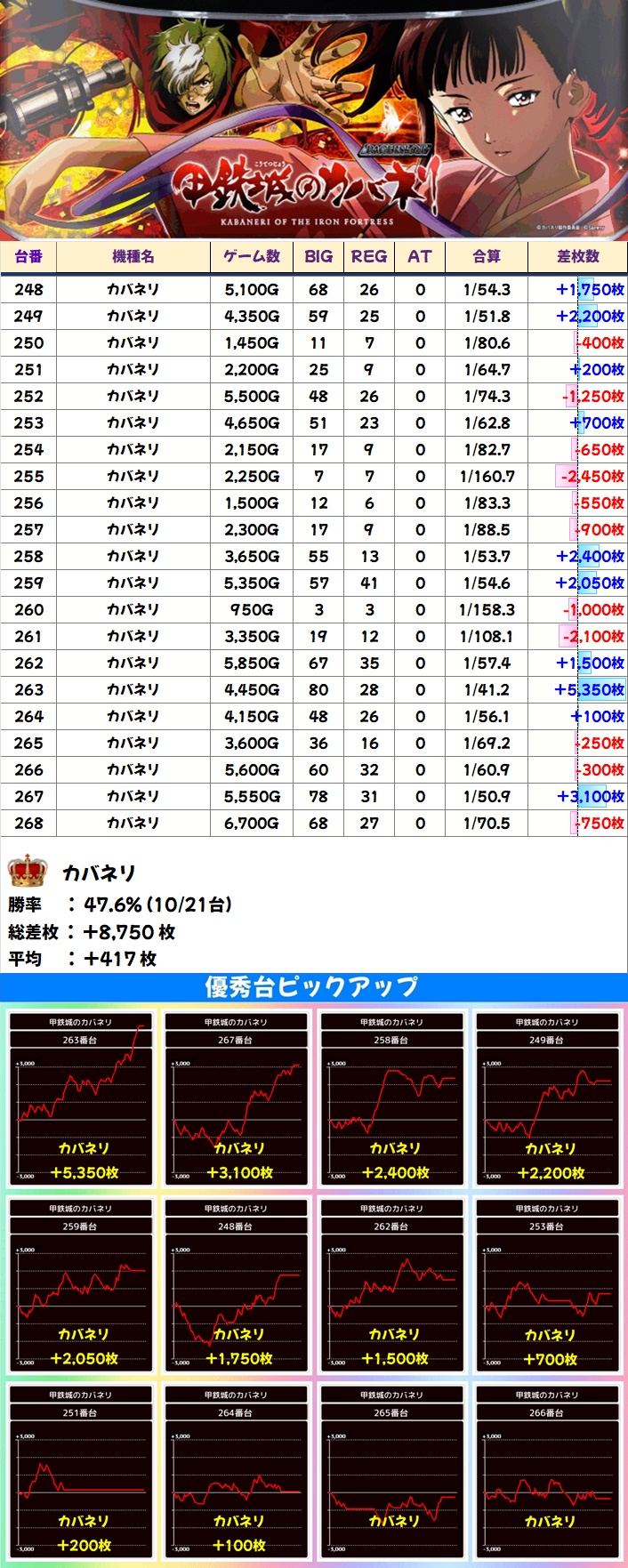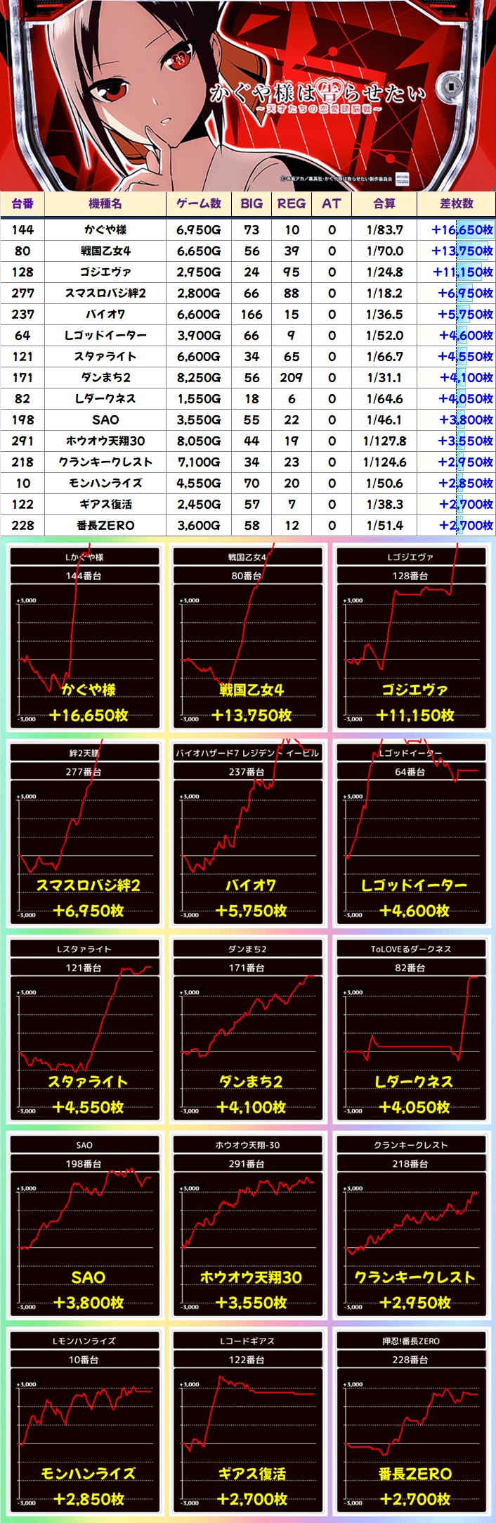 【かぐや様】【戦国乙女4】【ゴジエヴァ】の万枚オーバー台を筆頭に、全タイプからの優秀台も多数出現!単品優秀台は今回も至るトコロから確認できました!