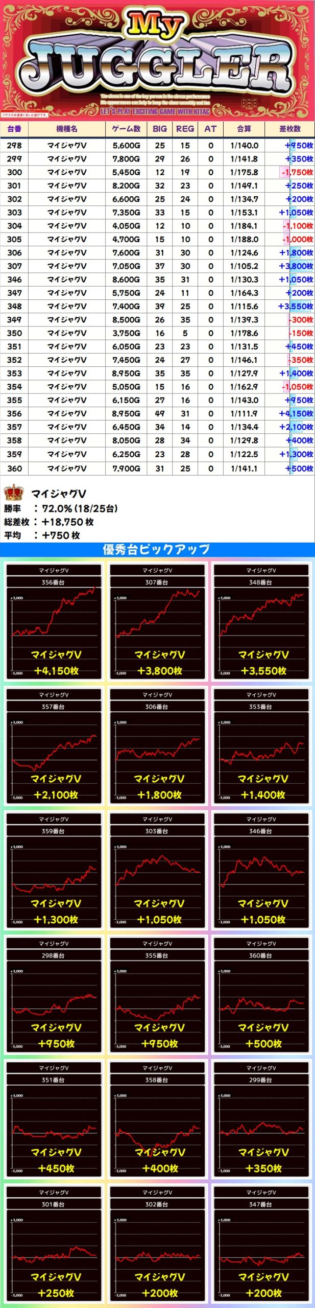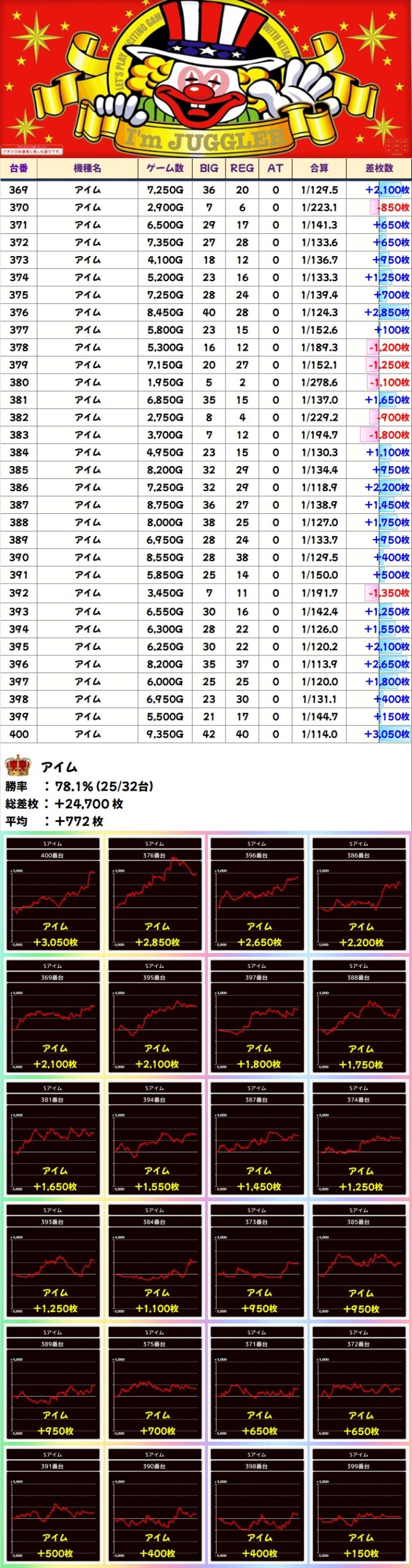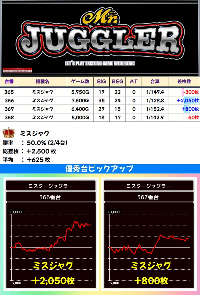 看板のアイム&マイジャグが中心に優秀台が多数出現!もちろん、その他のジャグ系からも高配分機種や単品優秀台アリ!ジャグ系は明日のキングパパでは据え置きに超期待!