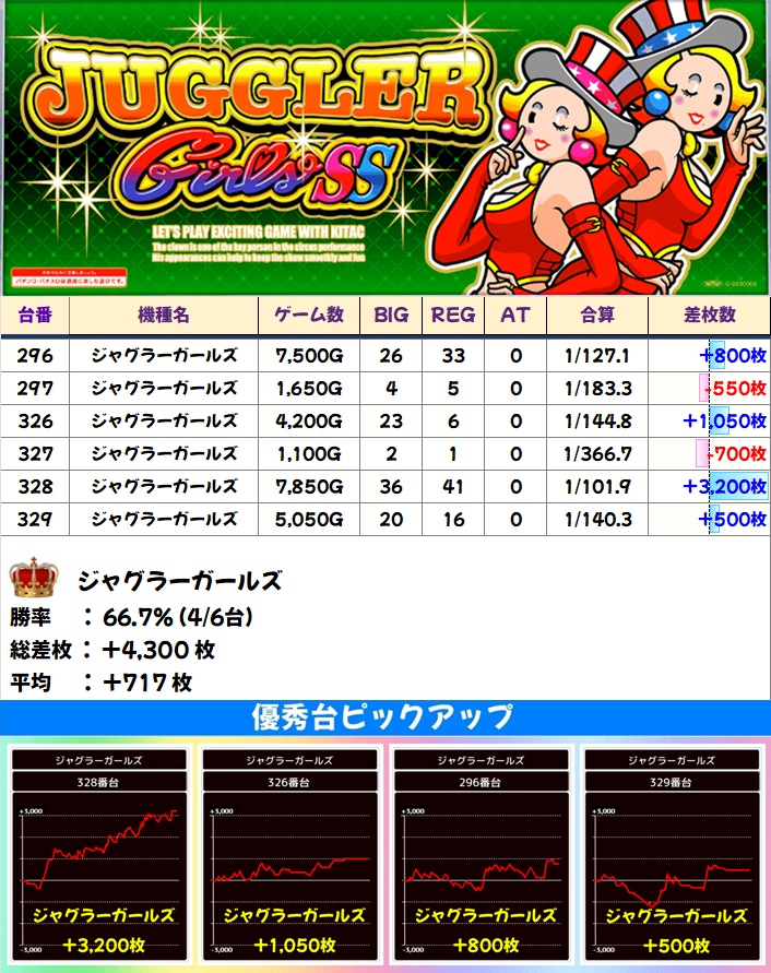 🌈ジャグラーガールズ(6台)【平均+717枚】