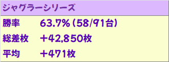 安定のジャグはいつも通りの高配分で、ジャグは勝率58/91の平均+471枚と好結果に!