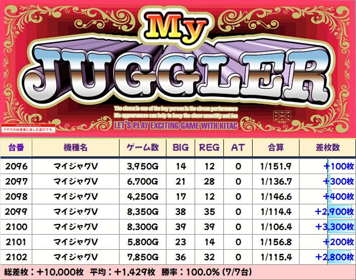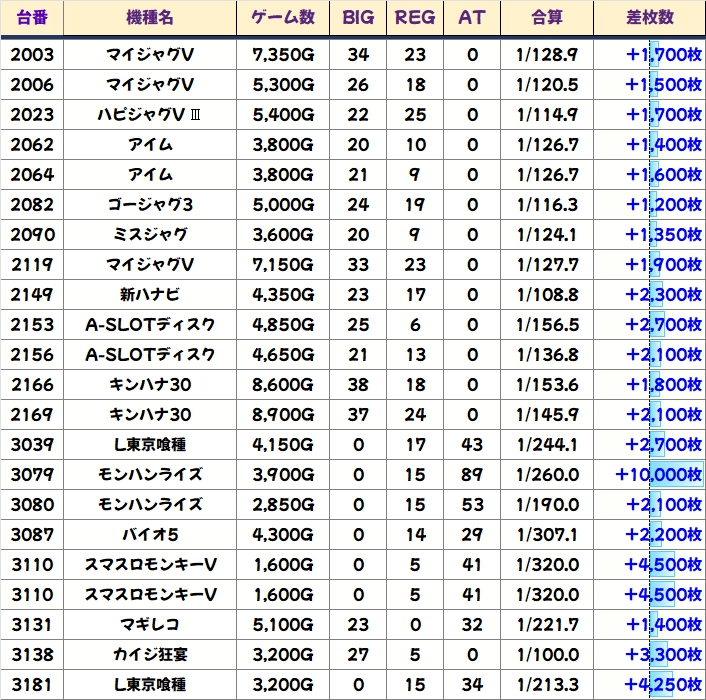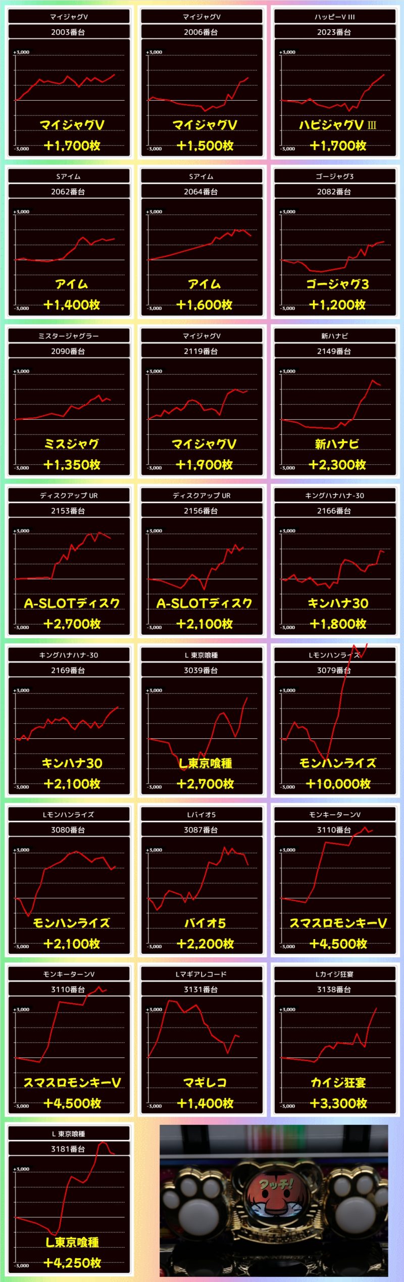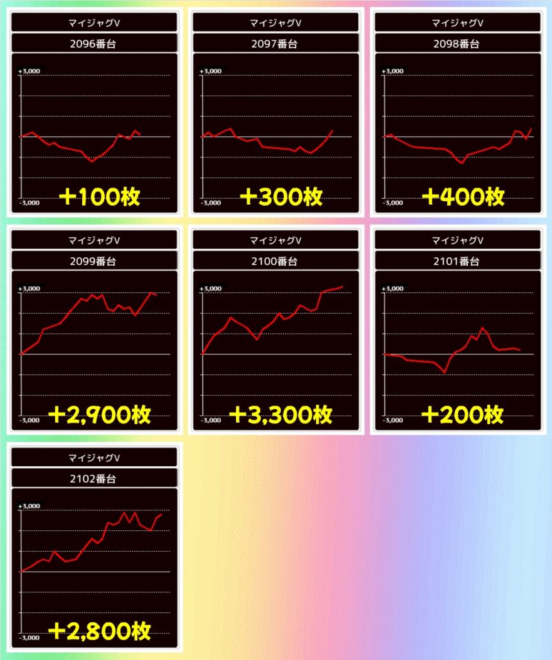 マイジャグにも並びがあり、全台プラス!大量出玉に直結しなかった台もありますが、稼働を見れば優秀台であったことは明らか。マイジャグも7の日は仕掛けが使われやすいので、狙い目機種の一つですよ。