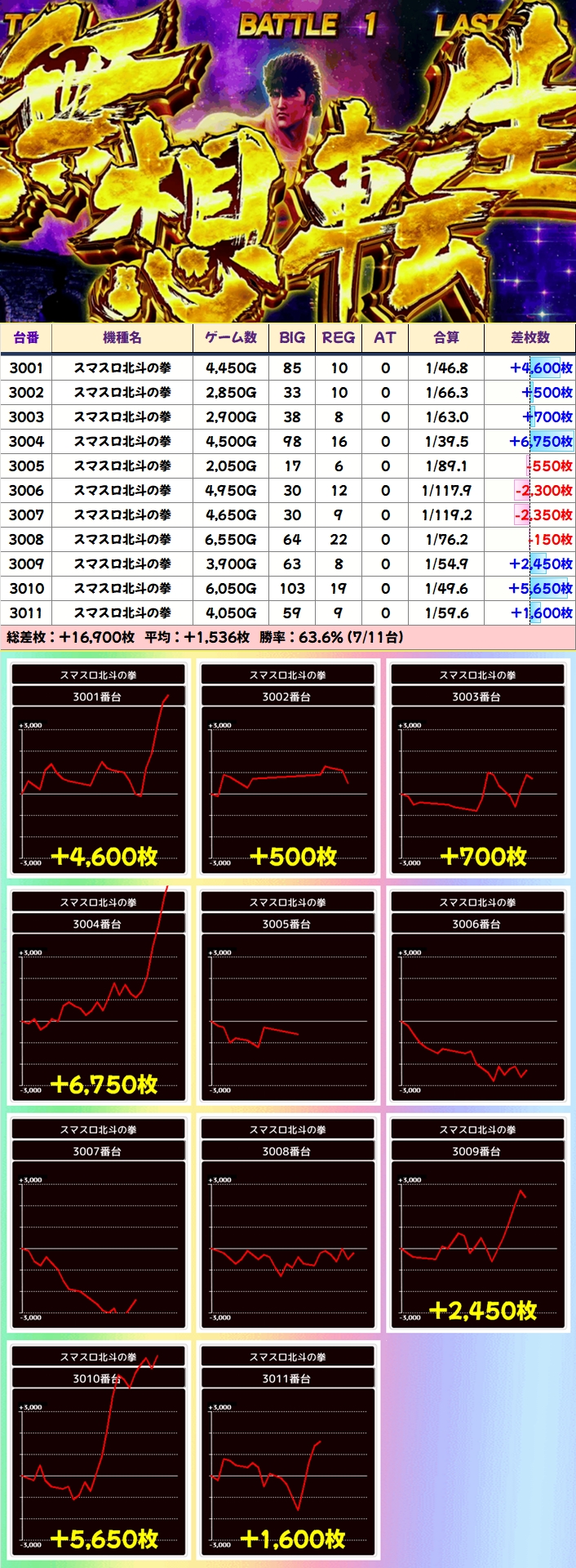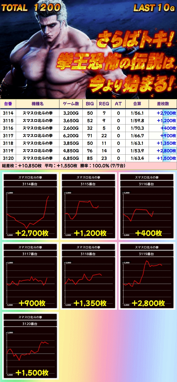 7の日は上記の北斗七星ポスターが登場することが多く、登場時のほとんどが北斗がプラス差枚でした。今回も勝率は6割超で平均+800枚オーバーと連勝記録を更新!