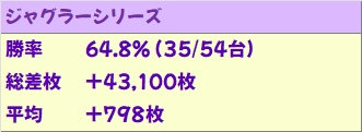 3シリーズが全系濃厚だったこともあり、ジャグは全体の結果で見てもかなりの優秀成績!勝率6割超で台平均約800枚のプラス!特日でジャグで1日遊べる方は狙いに行くのもあり!狙う際は高確率で仕掛けに絡むマイジャグから!