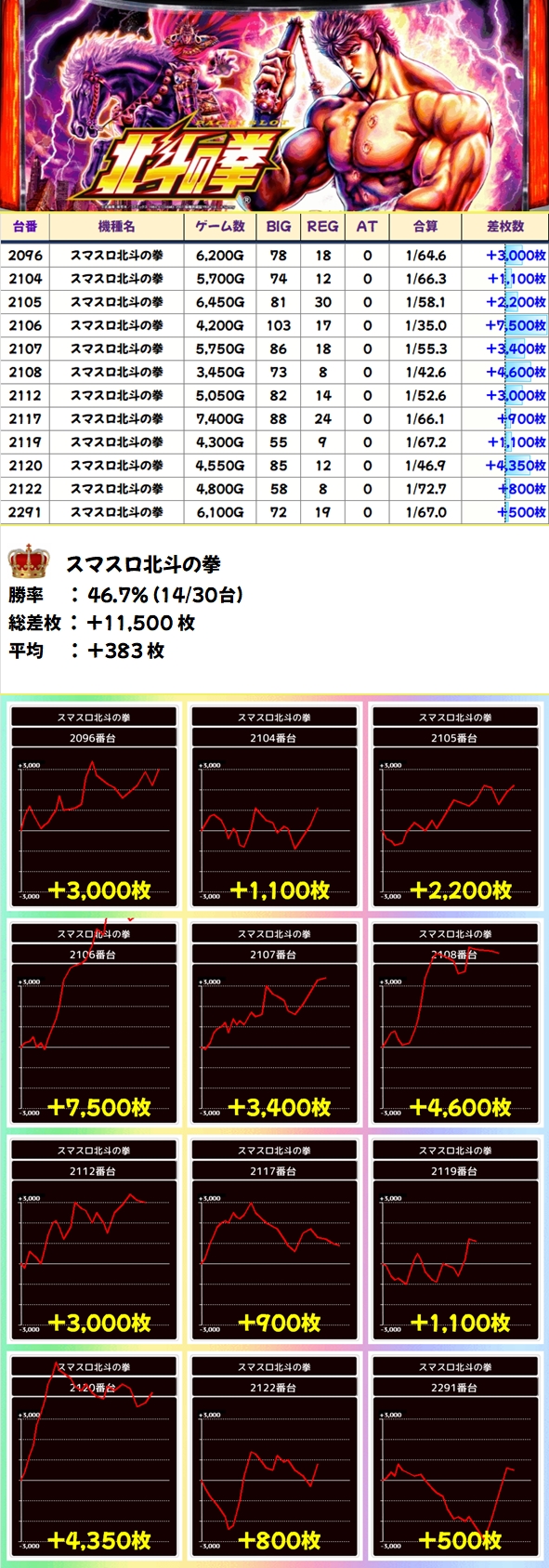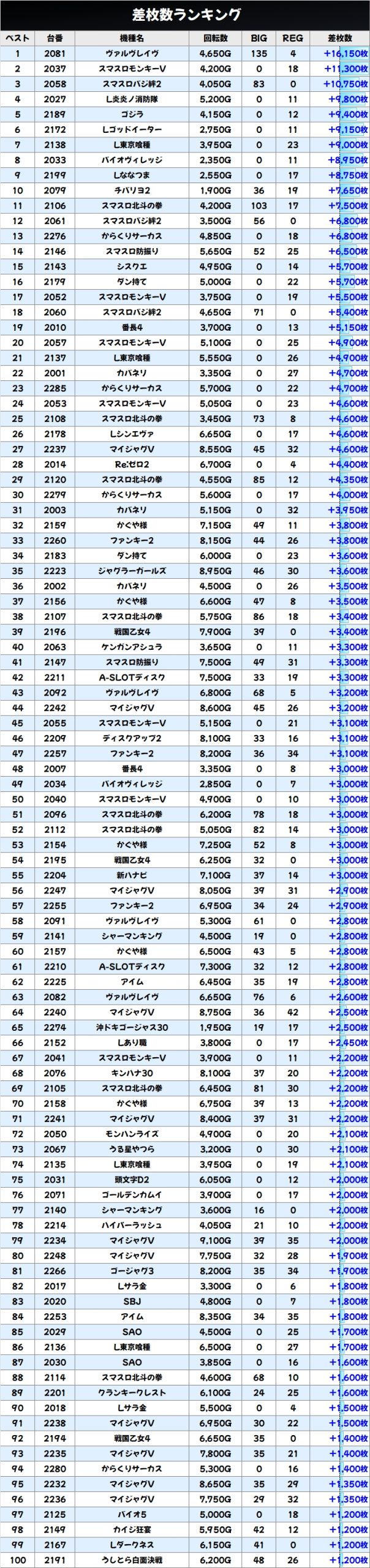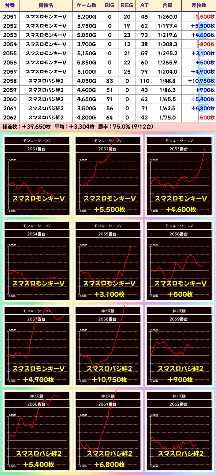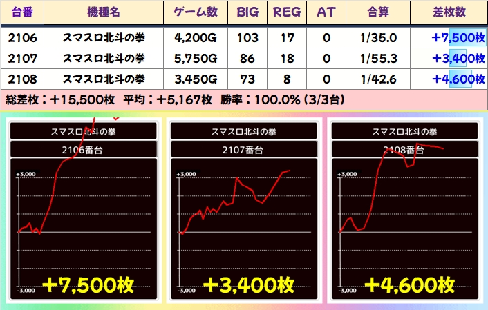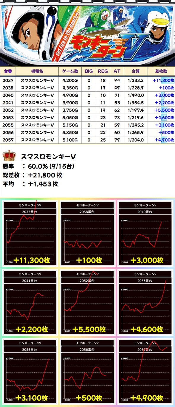 ノーマル含め全機種から+2000枚超台あり!1/2系ではあるものの、当たり台はかなり高品質台だったのは間違いないでしょう。モンキーVからは万枚超も飛び出し、北斗や番長4からも優秀出玉が出現しました!