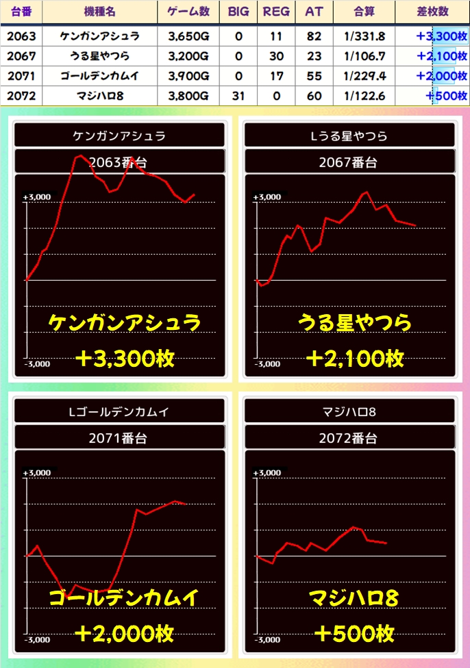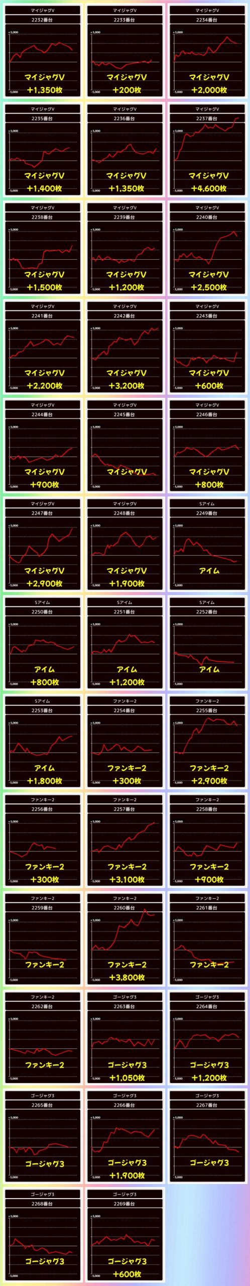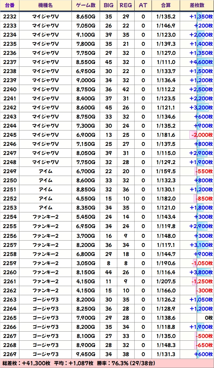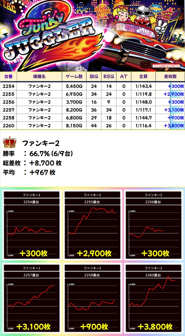 ジャグは3シリーズが全系濃厚!マイジャグは台数が多いですが1台以外プラス台だったので、かなり高ベースだったのは間違いナシ!全シリーズ+1000枚超は確認でき、ファンキー2やマイジャグからは+3000枚超台もあり!