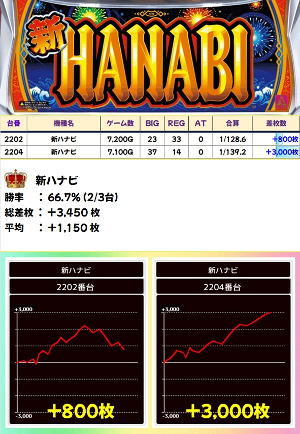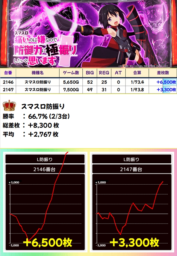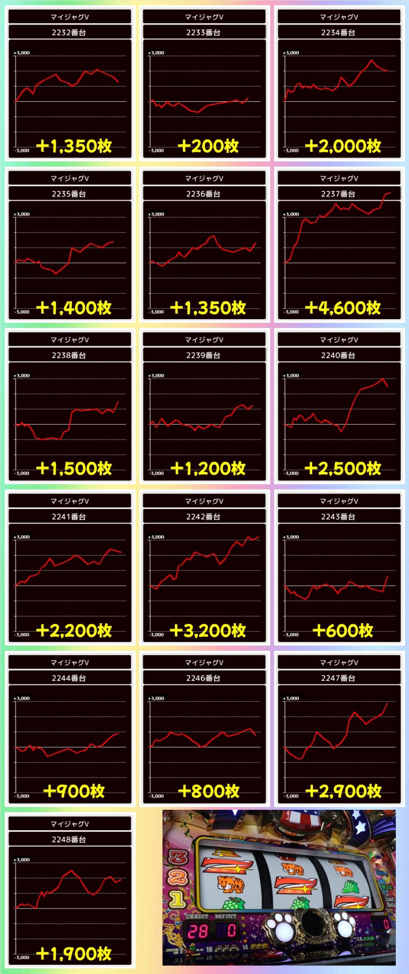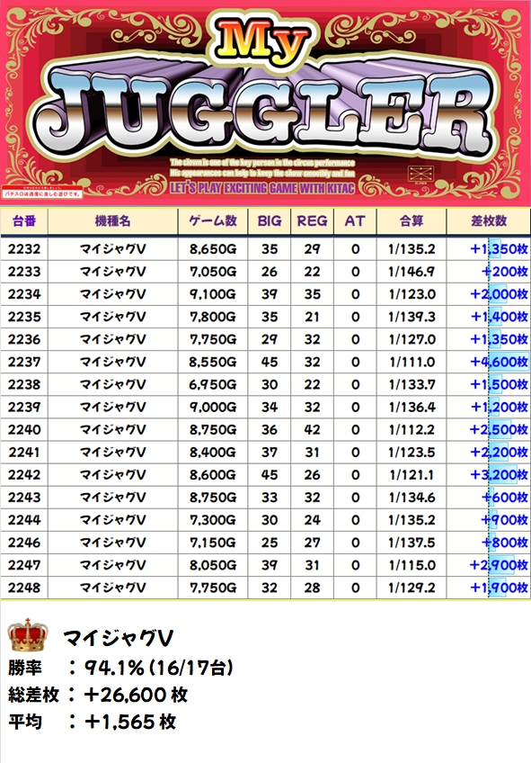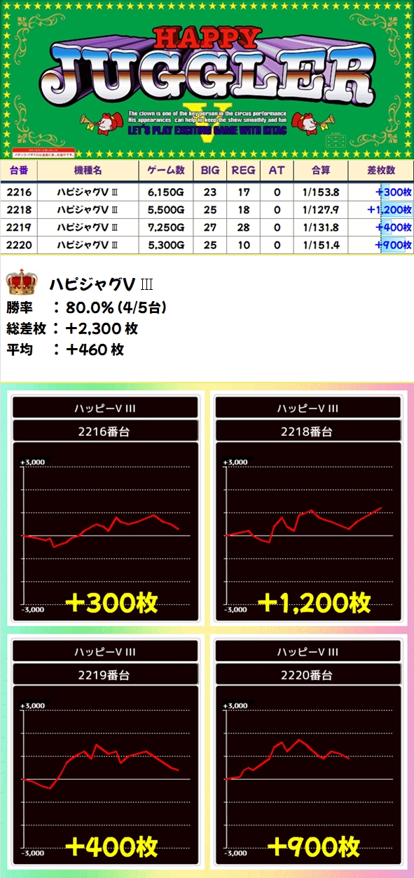 ジャグは3シリーズが全系濃厚!マイジャグは台数が多いですが1台以外プラス台だったので、かなり高ベースだったのは間違いナシ!全シリーズ+1000枚超は確認でき、ファンキー2やマイジャグからは+3000枚超台もあり!