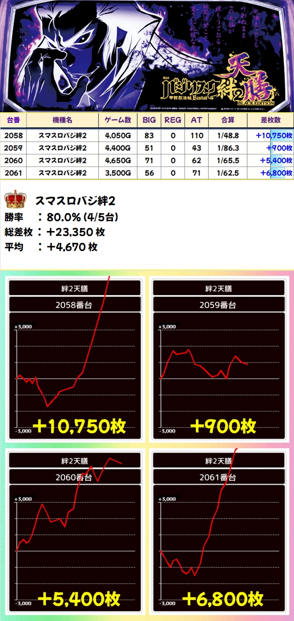 100台以上が+1000枚超を獲得し、3台が万枚超!土曜日は毎回独り言が発動し独り言関連機種は他の仕掛けよりも優秀成績を残しがちなので、打ちに行ける土曜日はまず前日の謎解きが大事!ある程度独り言機種のめどを立てて当日は抽選番号によって狙う機種を決めましょう。