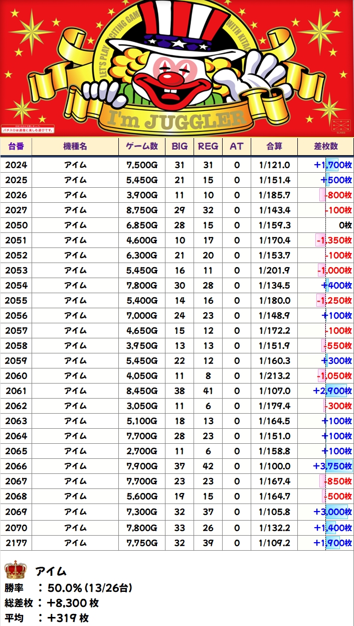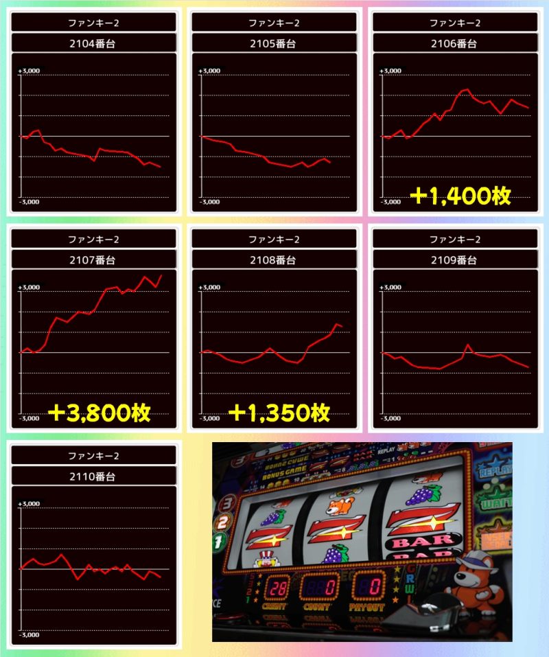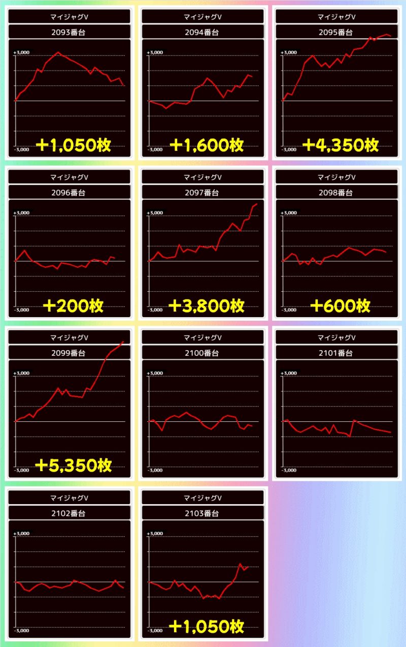 いずれのシリーズからも+1000枚超は確認でき、マイジャグからは+4000や+5000枚超の爆裂台も!それぞれ稼働にも差があるので、打ち手もしっかりと看破し、粘るべき台はブン回していたのでしょう。