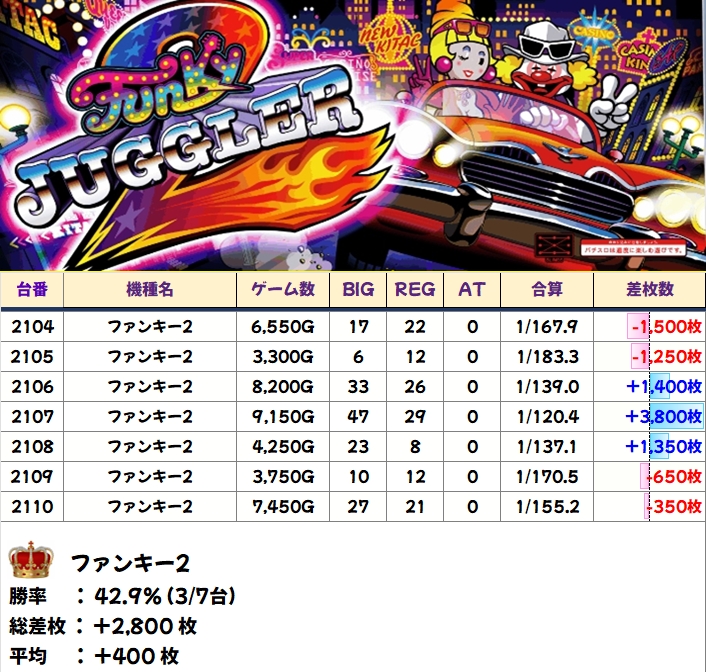 5の日は機種名に5のつくモンキーVも優秀になることが多く、今回は2台が+3000枚超!5の日の液晶付き機種で狙うなら第1候補!