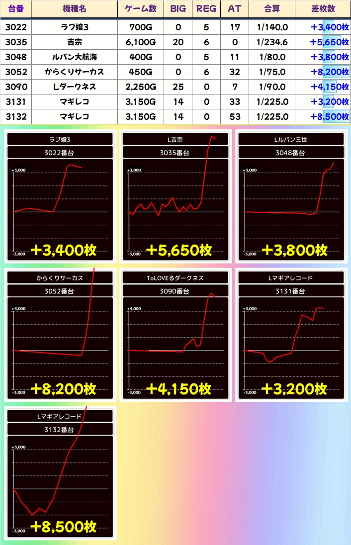今回も優秀機種を複数確認でき、総差枚は6万枚のプラス!