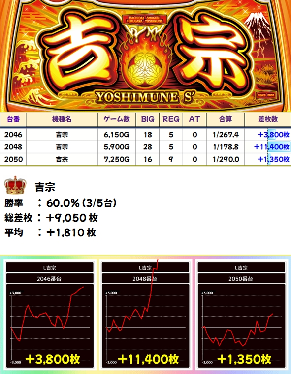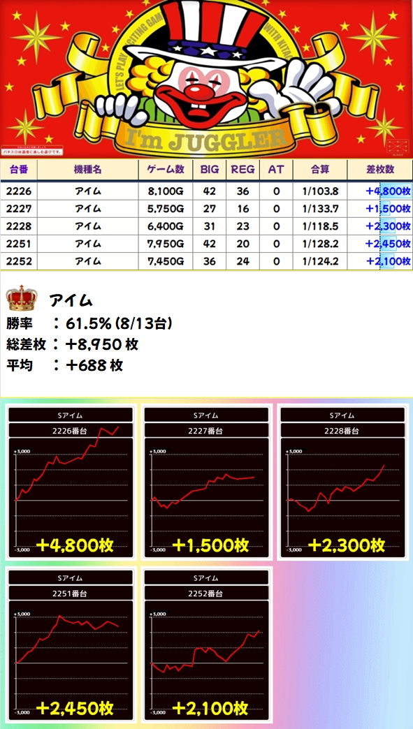高配分機種も4機種もあり、最新の吉宗や根強い人気の戦国乙女4はどちらも万枚超や大量獲得台複数あり!ジャグは独り言絡みに関わらず対象のシリーズはすべてしっかりと稼働し、台平均も優秀なのでかなり力が入っていたことと思います。