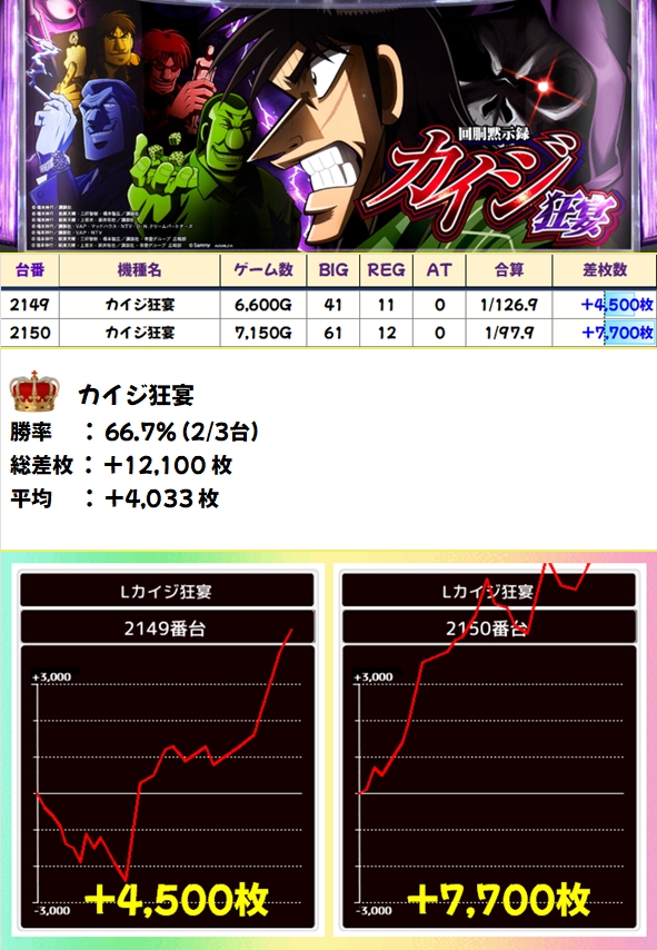 全系濃厚のスマスロは東京喰種から万枚超、カイジから7000枚超とどちらも大量獲得台が複数あり!マイナス台も少なく、かなり盛り上がりを魅せていました。