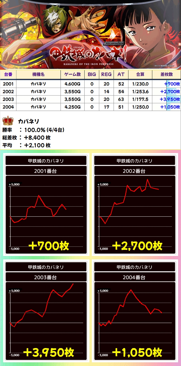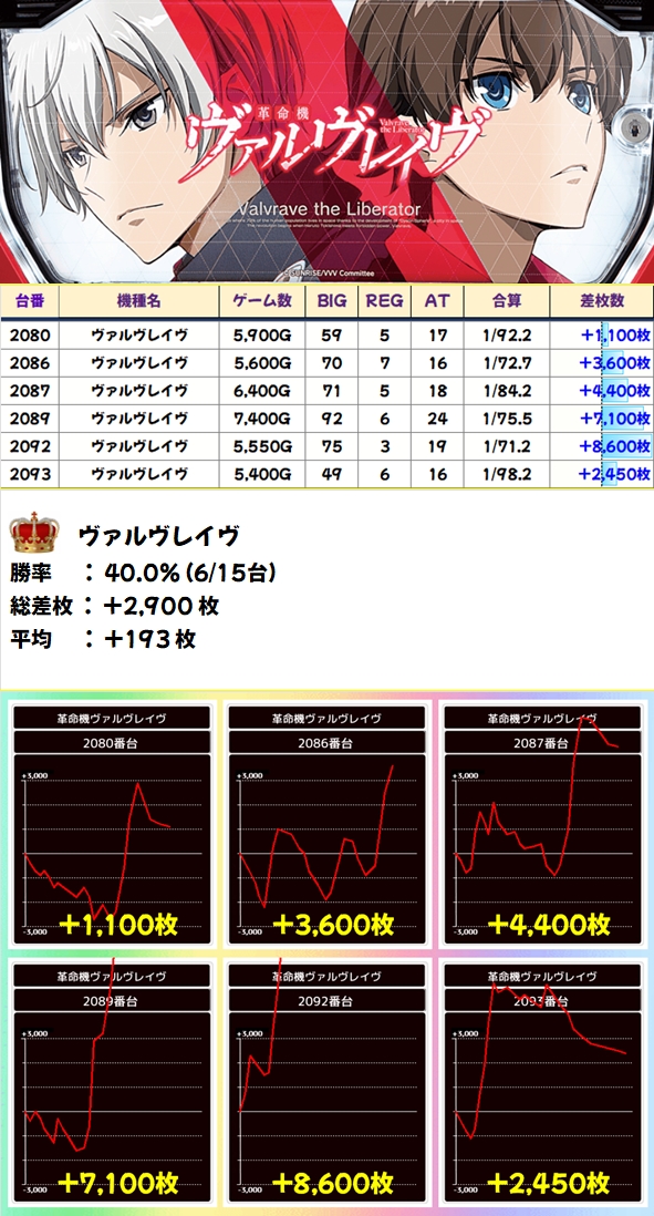 超ポスター期間中のヴァルヴレイヴも高配分以上で+3000枚超が計4台。明日も期間内ではあるので、これまでの結果を参考にし結果の残していない台を優先に立ち回りましょう。