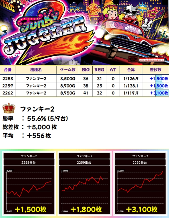 なぎちゃんの独り言絡みの1/2系は下記3機種。北斗やモンキーVからは+5000枚超台も複数あり、それぞれ台平均も+1000枚クラス。ファンキー2も優秀台は8000G以上回されているので、打ち手は察していたことでしょう。