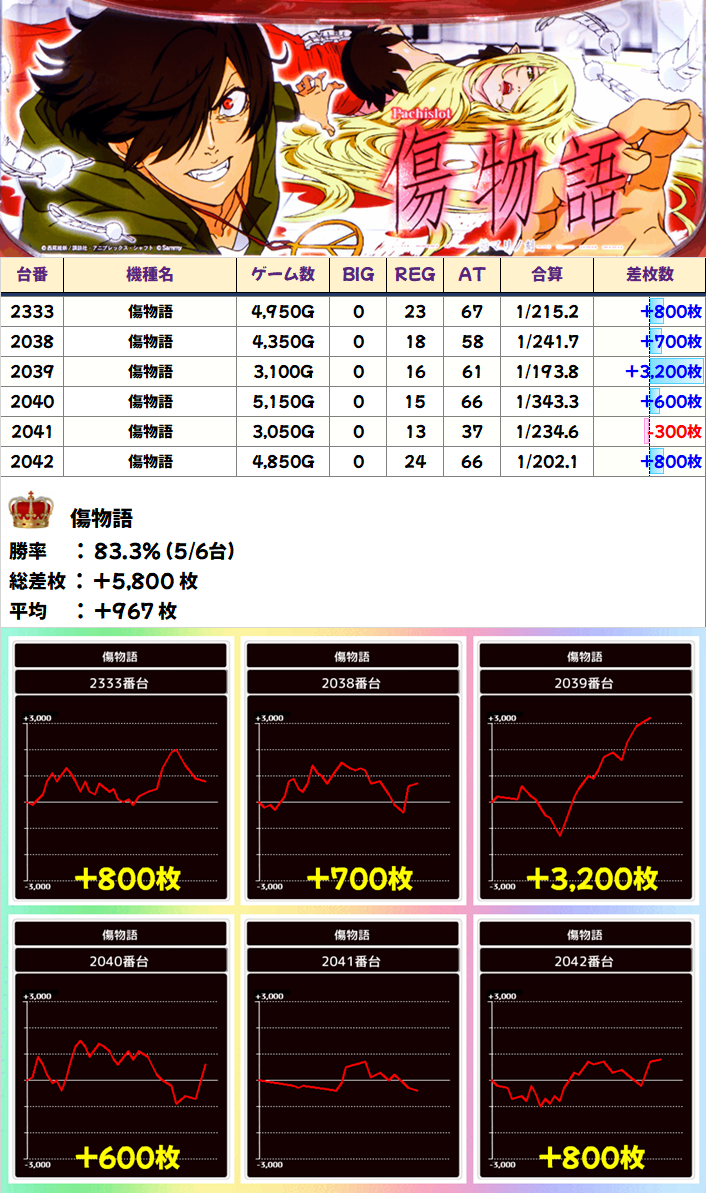 2038(2333)~2048番台の「傷物語」「このすば」「グランベルム」も機種またぎの列全! こちらは2台のみがマイナスと総じて好成績を残し、平均差枚+1463枚となりました!
