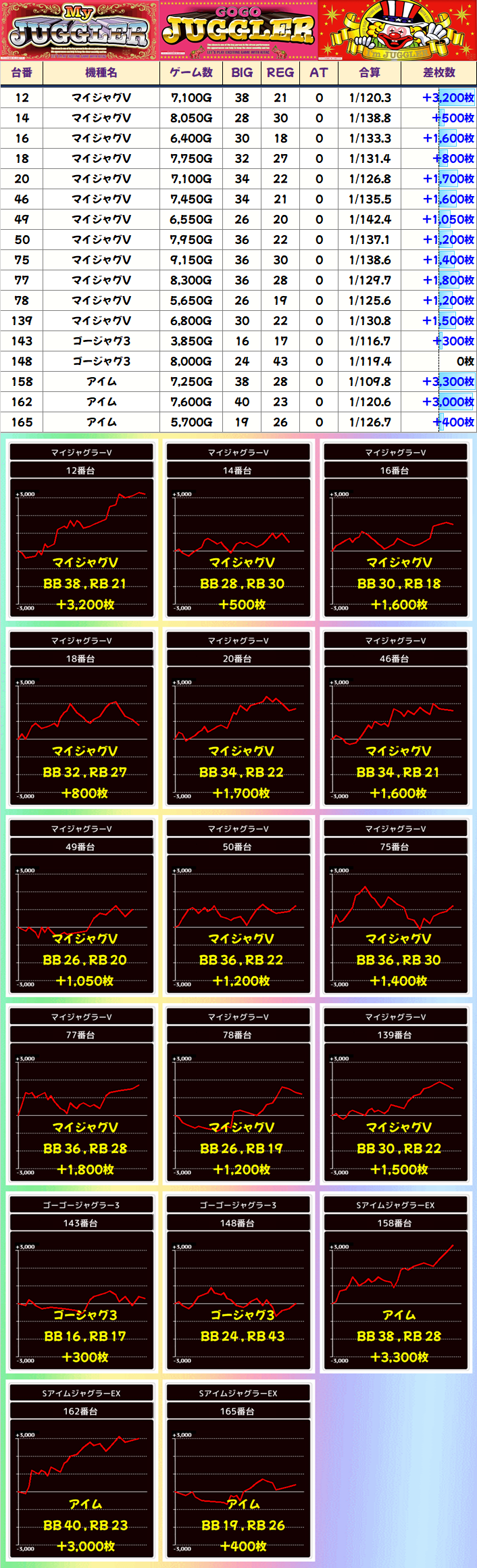 166~177番台の「ペルソナ5」「盾の勇者」「蛇喰夢子」「バイオ7」「メイアビ」「戦コレ5」が全台系となりました。12台中10台がプラス、12台の平均差枚は+1879枚と申し分ない結果に!
