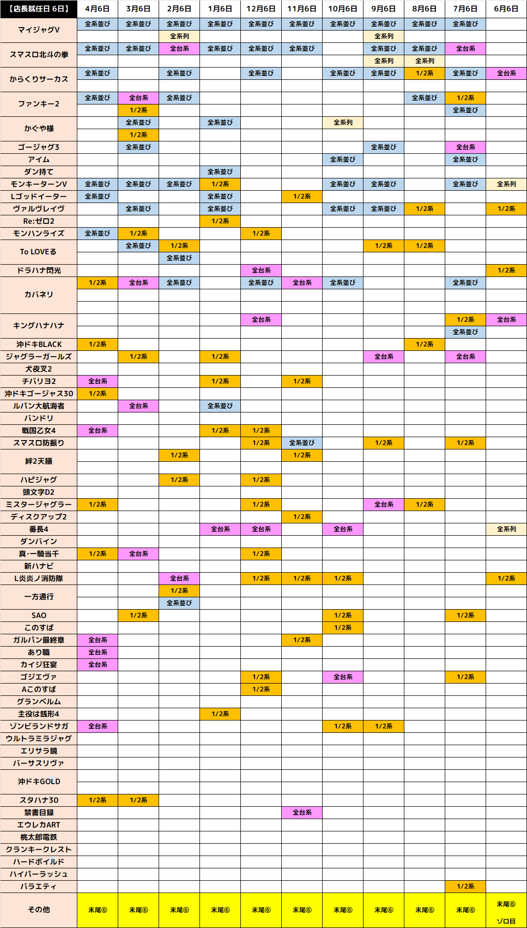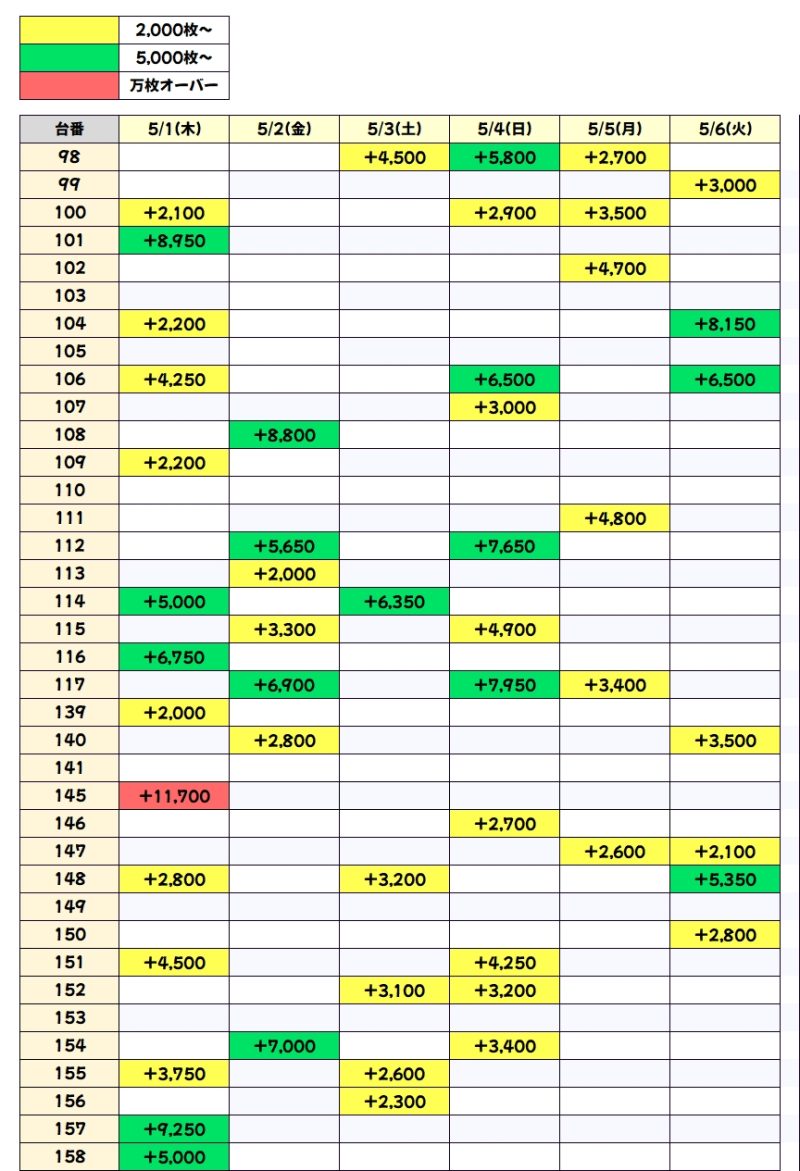 今回はGW最終日となった5/6の結果をレポート。毎月6日は店長就任日で全台系濃厚や末尾、並びの仕掛けなど王道の仕掛けが複数機種に出現する傾向があります。