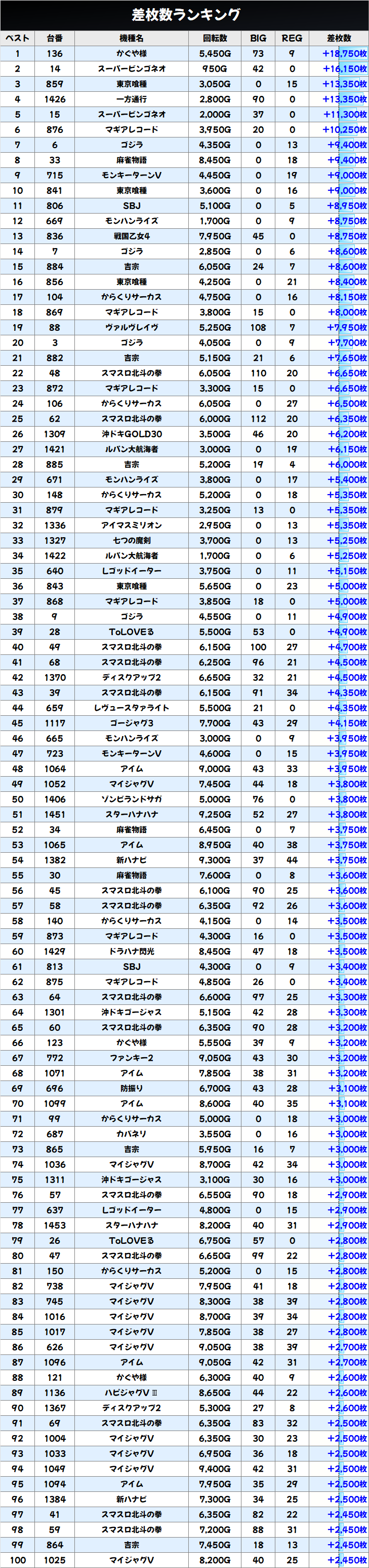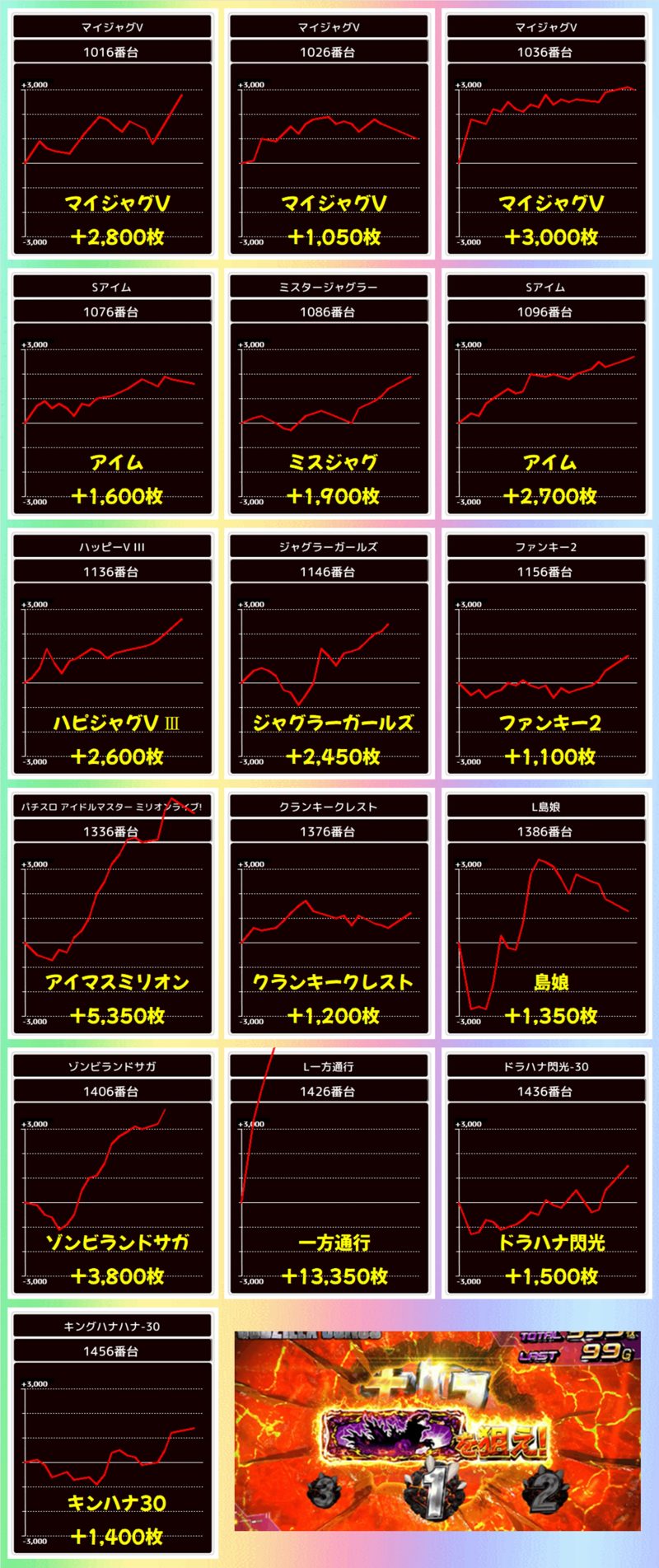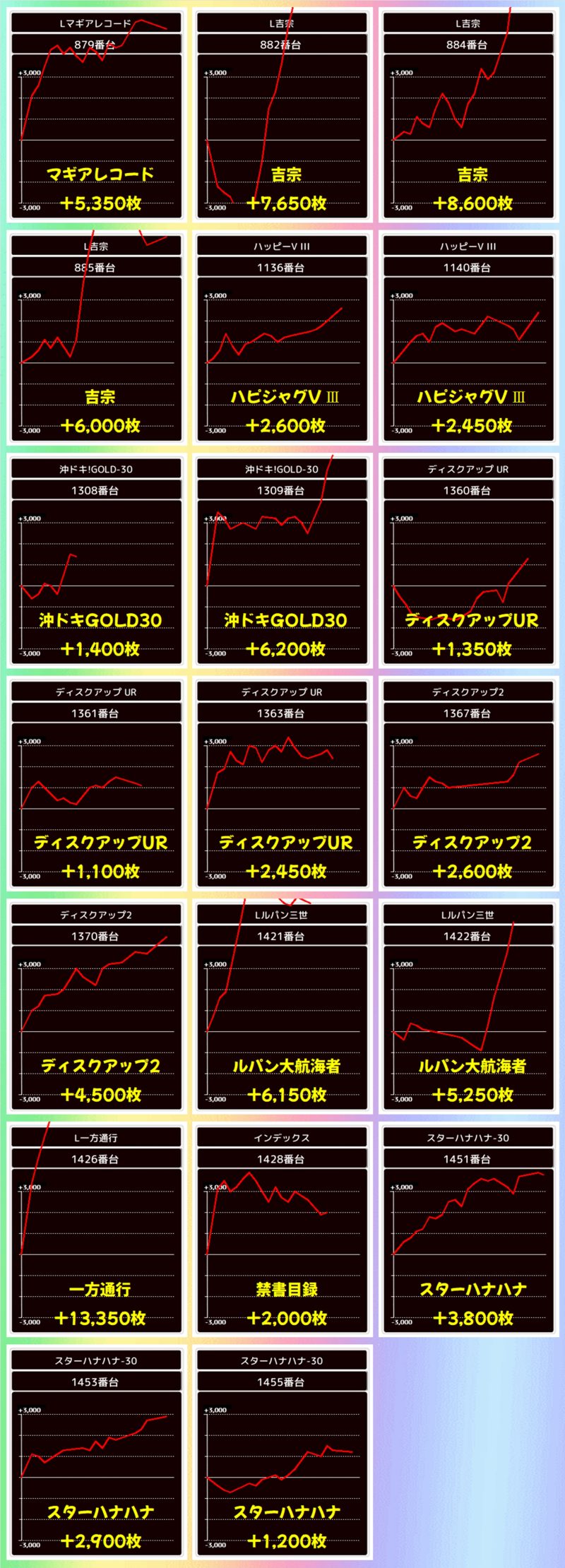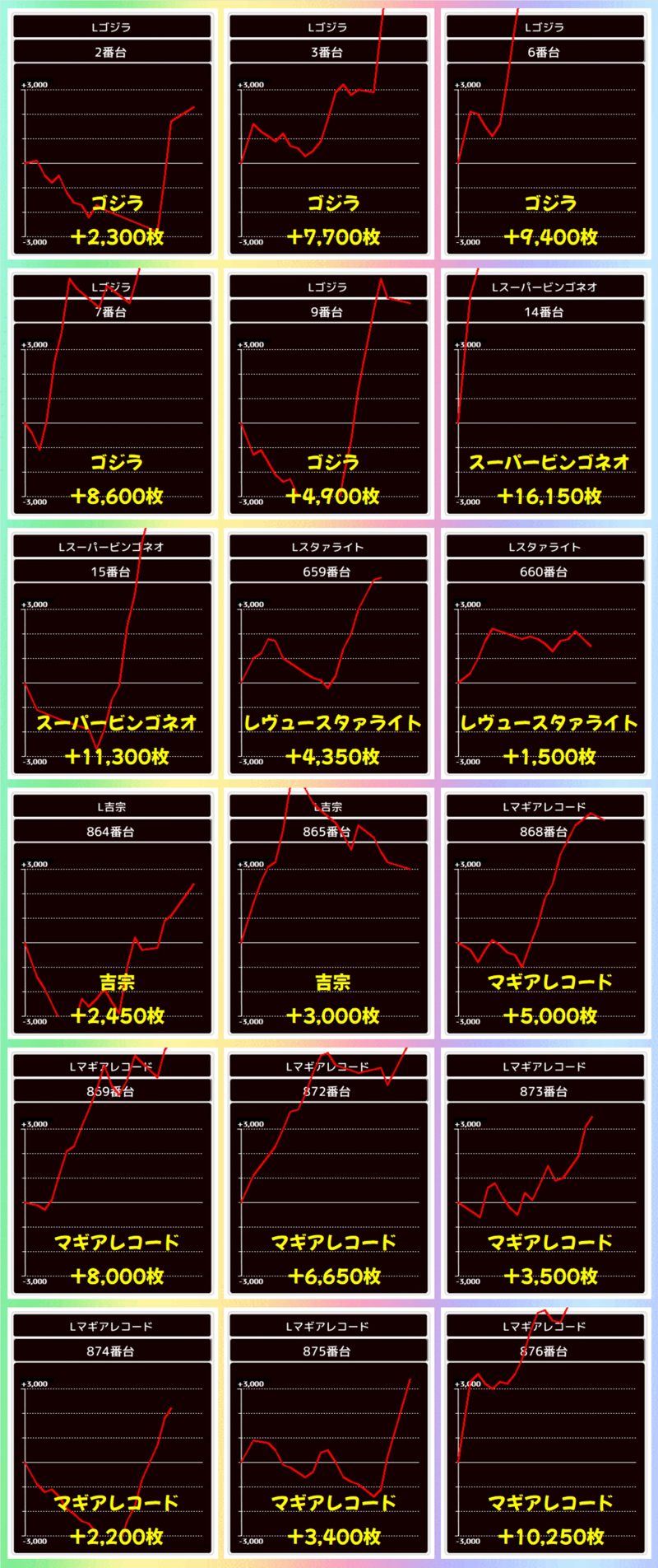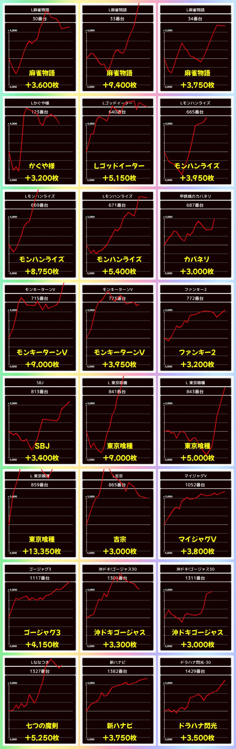 また、1/2系濃厚の仕掛けでも紹介しましたが、一方通行とマギアレコードからは万枚オーバーが飛び出し、さらにかぐや様の末尾⑥からは+18750枚の超大量出玉を確認。それ以外にも多数の機種から優秀な出玉が出現しておりました!