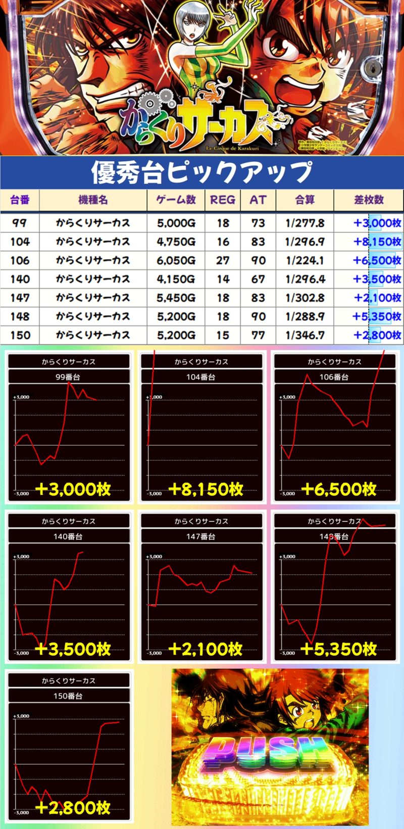 からくりサーカスからは+8150枚の大爆発を確認。また、末尾⑥番台からも+6500枚の優秀な出玉が出現しました!