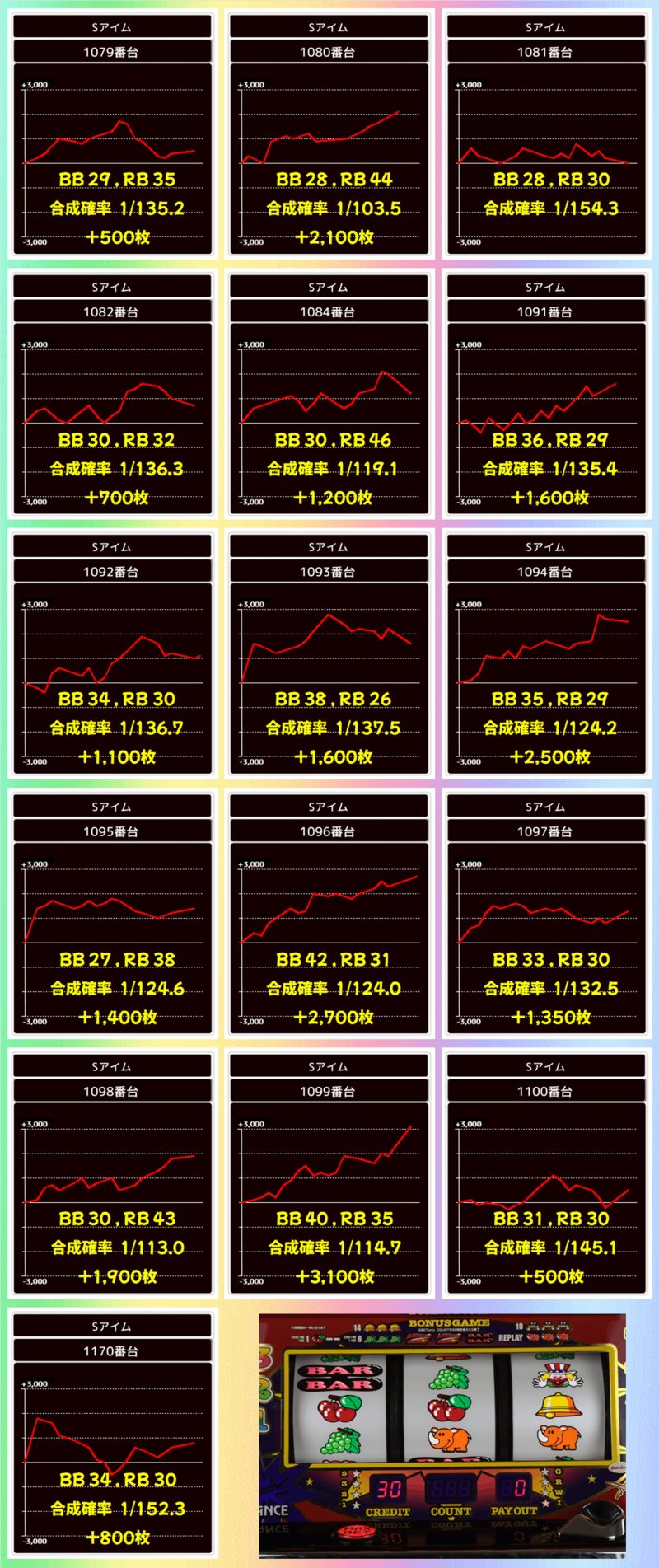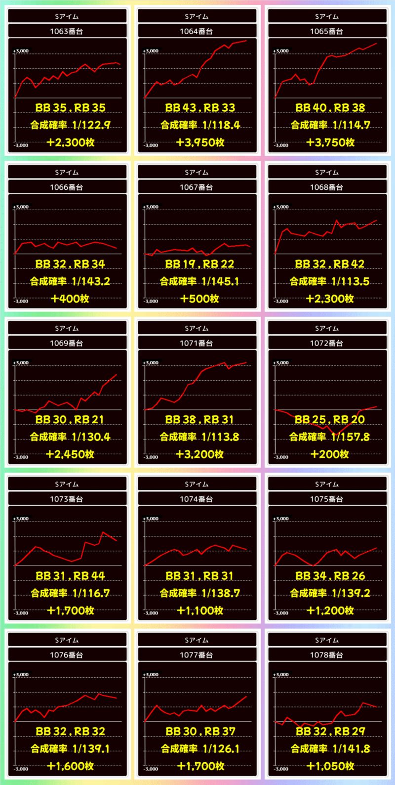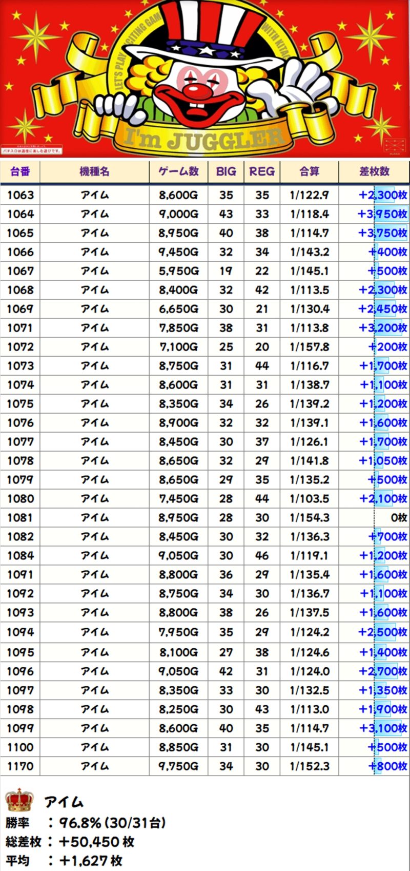 アイムからは+3950枚や+3750枚など+3000枚オーバーの大量出玉が多数出現し、31台中30台がプラスという見事な結果となりました。
