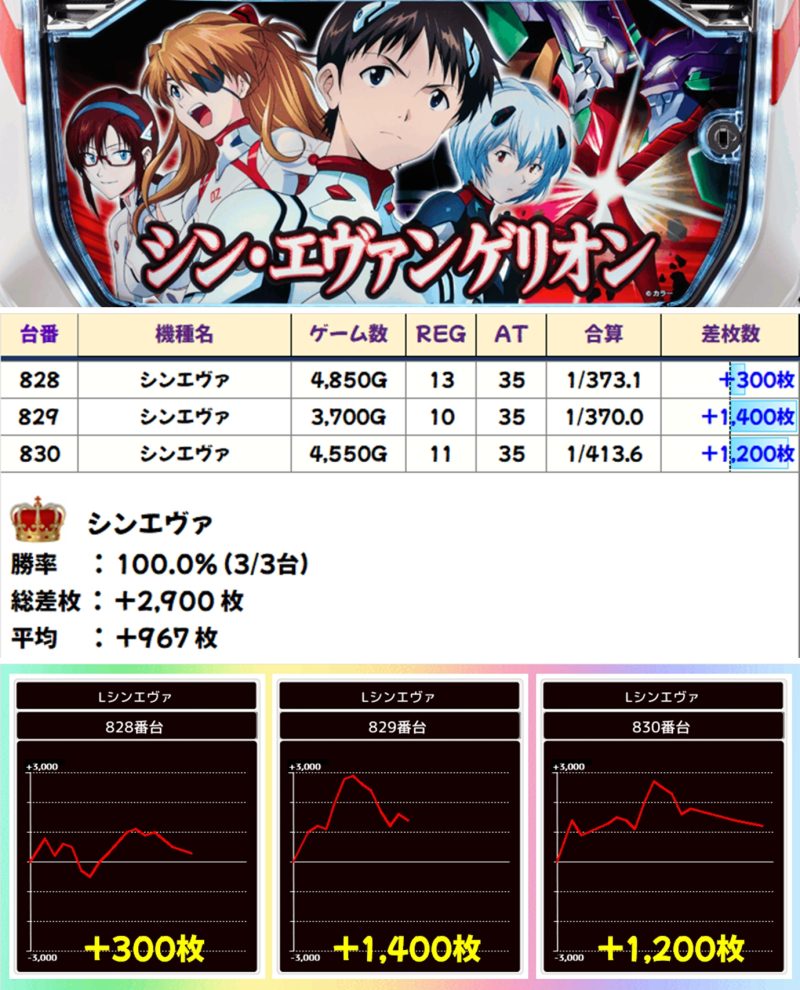 シンエヴァも全台系濃厚。出玉は伸び悩んだ印象がありますが、シンエヴァの3台は全台がプラスとなっておりました。