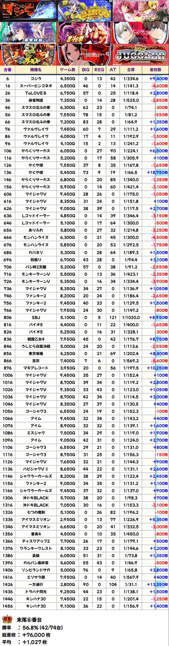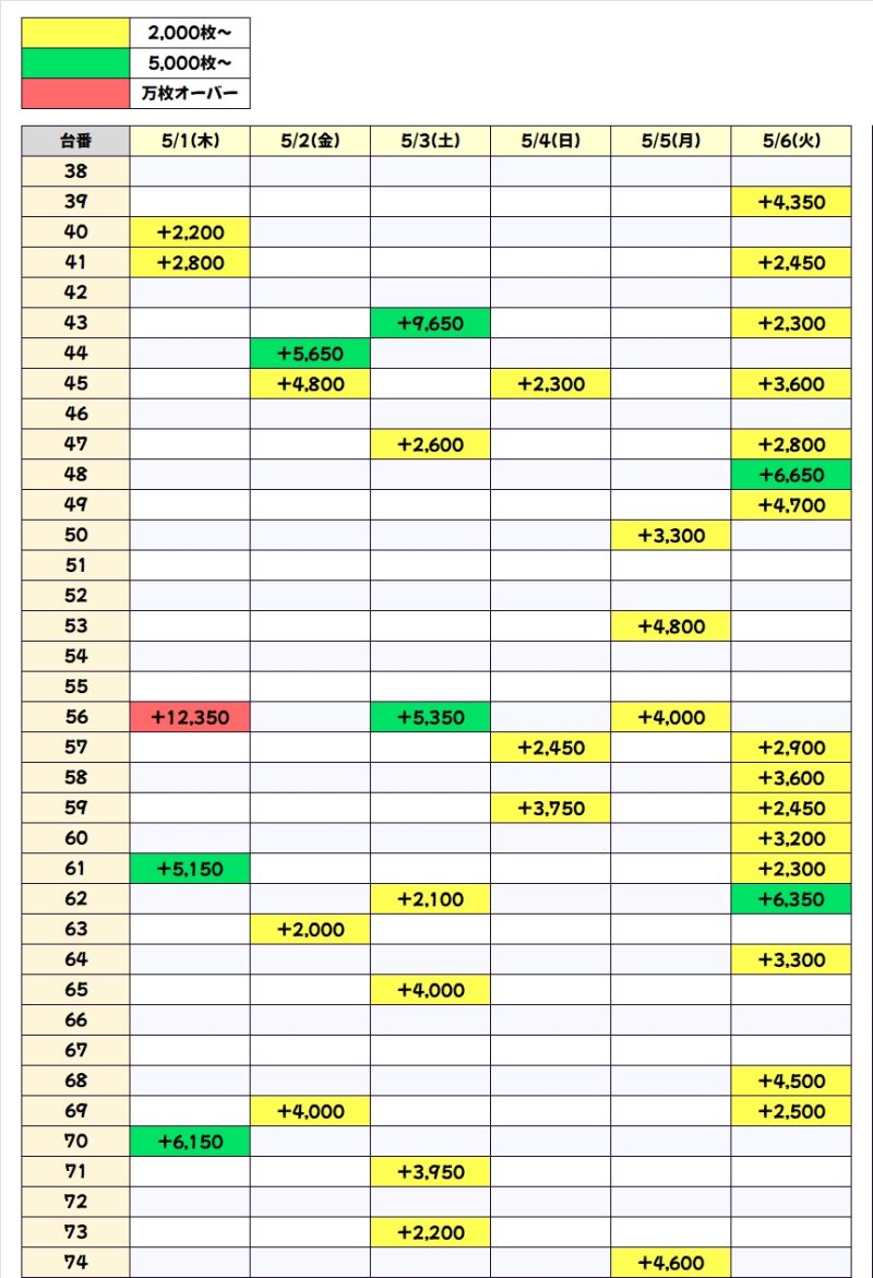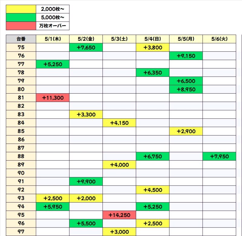 この日は末尾⑥番台のかぐや様から出現した+18750枚を筆頭に万枚オーバーが6台出現。+3000枚以上の大量出玉は75台出現しました。GWの最終日もしっかり優秀台を確認することができましたね!