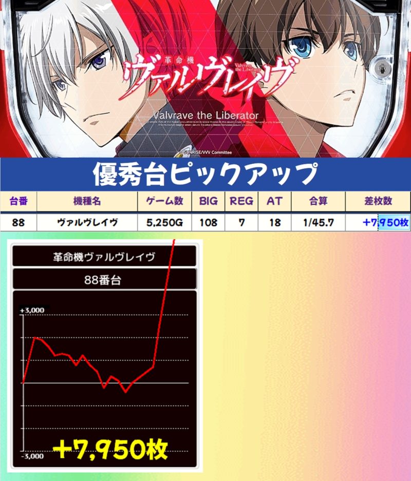 ヴァルヴレイヴは不発気味でしたが、+7950枚の大量出玉もアリ。明日以降の優秀台に期待したいですね!