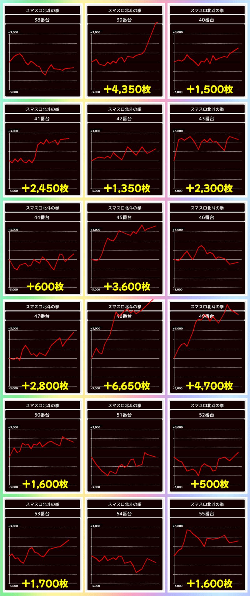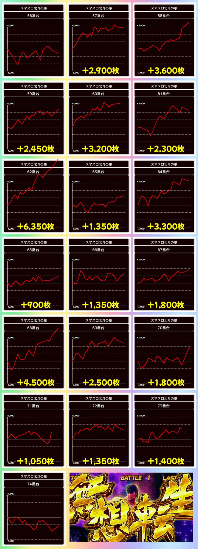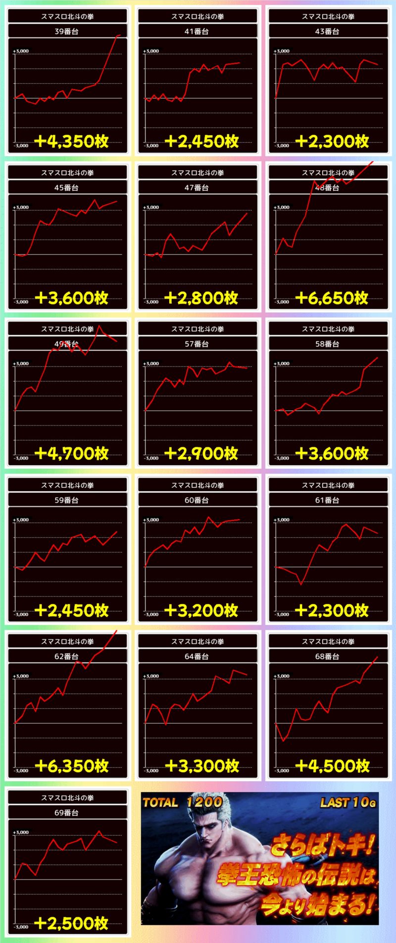 全台系濃厚だったので当然ですが、スマスロ北斗の拳からは+6650枚を筆頭に多数の大量出玉が出現しました。