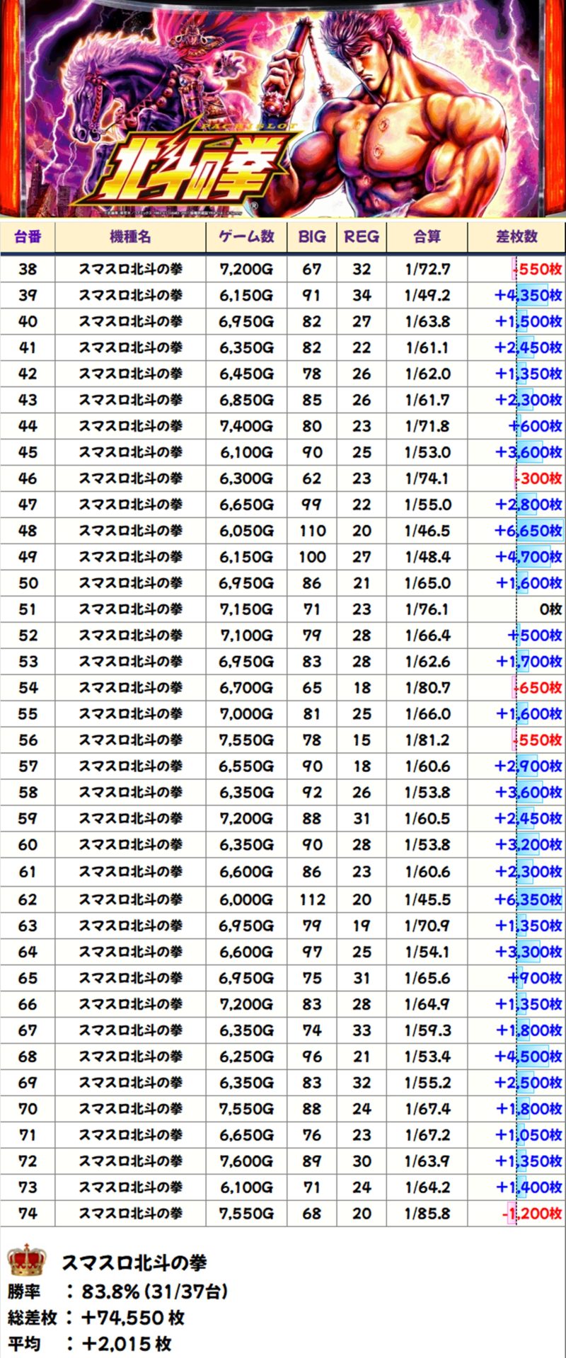 毎日オススメ機種でもあるスマスロ北斗の拳の全37台が全台系濃厚となり、+6650枚や+6350枚などの爆裂も確認。残念ながら不発の台もありましたが、31台がプラスとなり平均では+2000枚を超える好結果となりました!