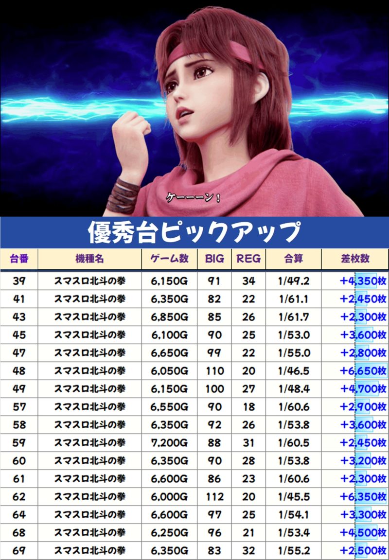 ここではそれぞれの優秀台(+2000枚以上)をピックアップ。スマスロ北斗の拳は全台系濃厚でしたが、改めて優秀台としてピックアップしていきます。それぞれの優秀台をチェックして明日以降の立ち回りに活かしてください!